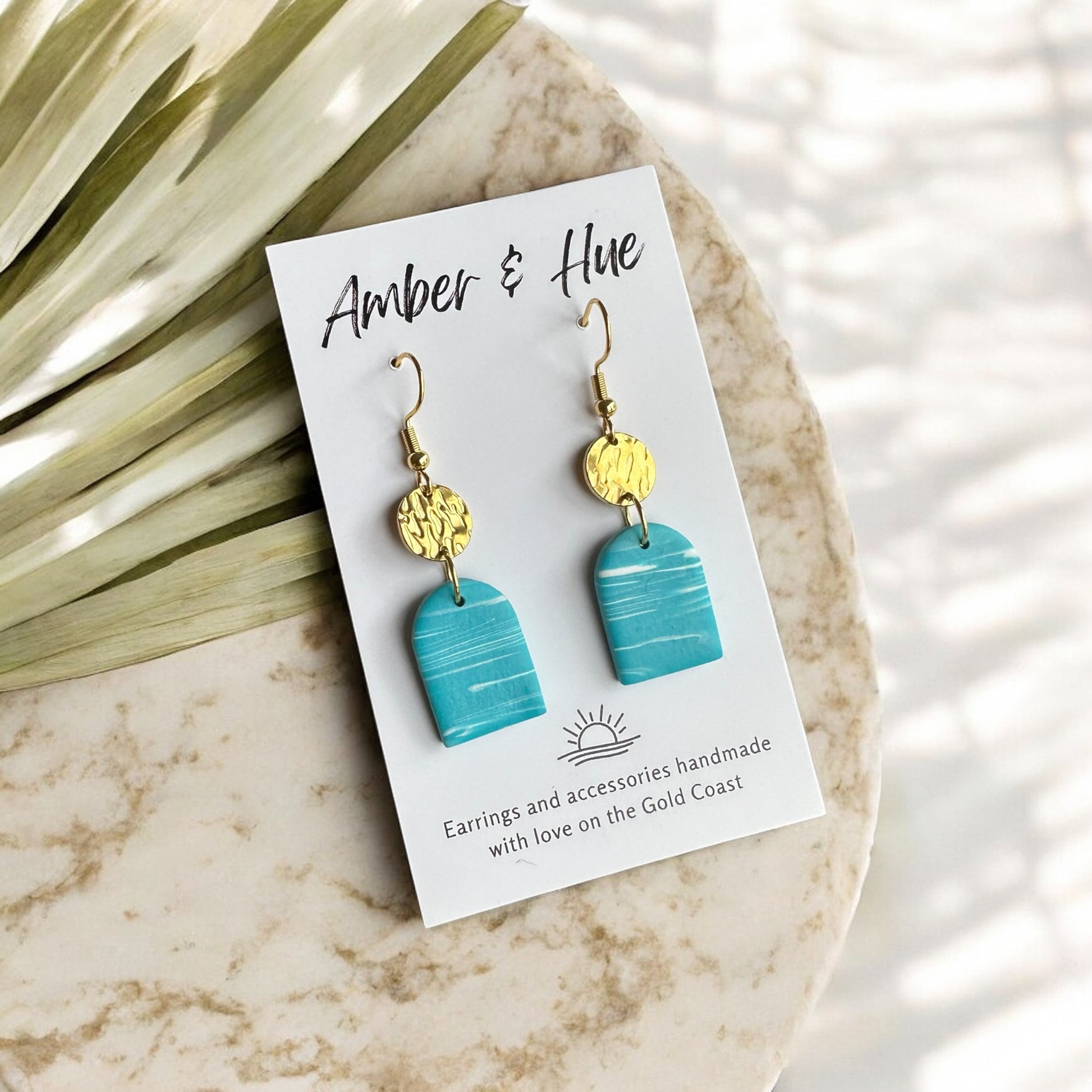 Each earring features a beautifully swirled aqua marble effect, subtly infused with shimmering gold accents, creating a captivating and unique design. The dainty disk shape offers a modern yet timeless aesthetic, ensuring these earrings will complement any outfit, from casual chic to sophisticated evening wear.