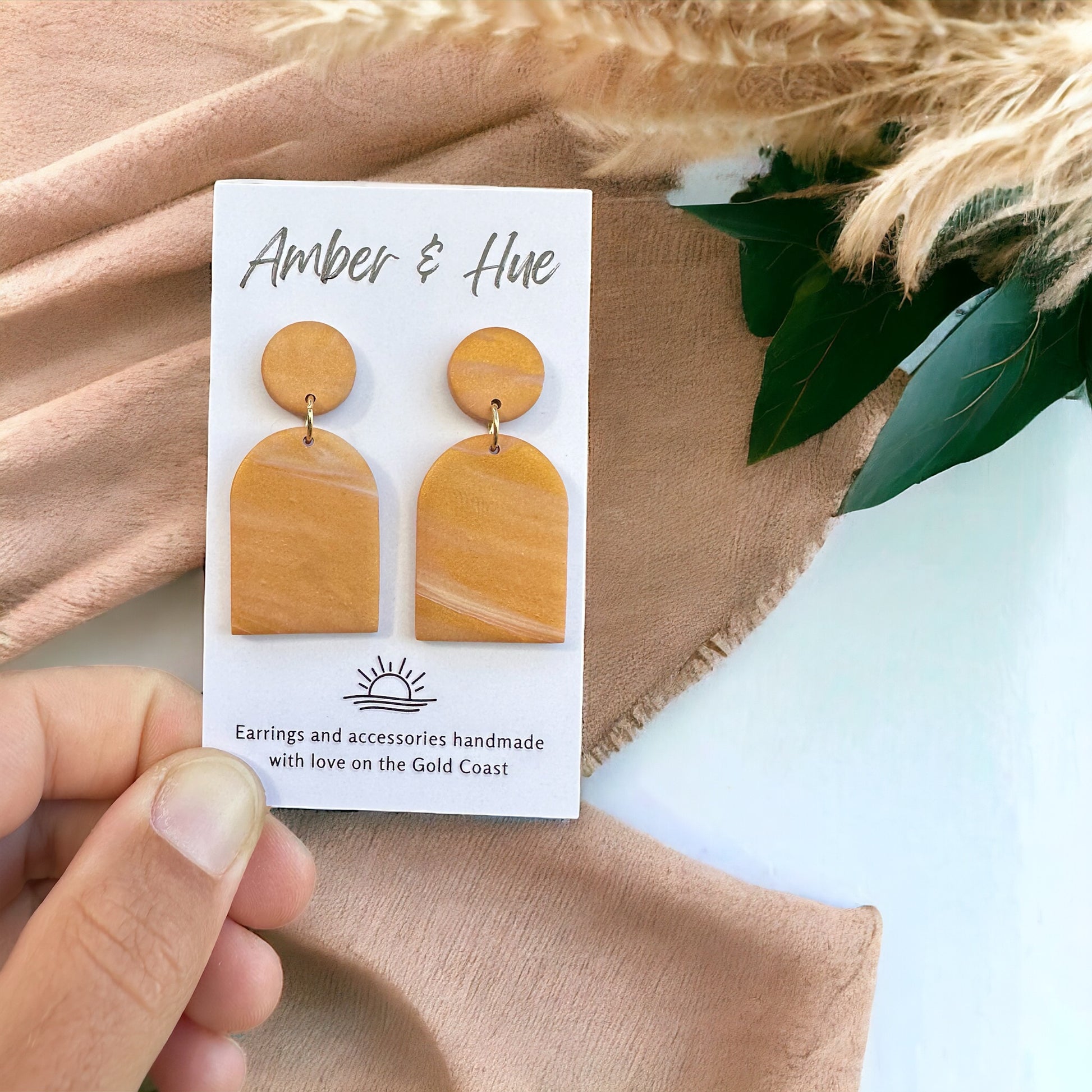 Elevate your look with these captivating arch dangle earrings, meticulously handcrafted from gleaming polymer clay. The graceful arc shape and warm golden hue exude timeless elegance and sophistication, making them a perfect choice for any occasion.