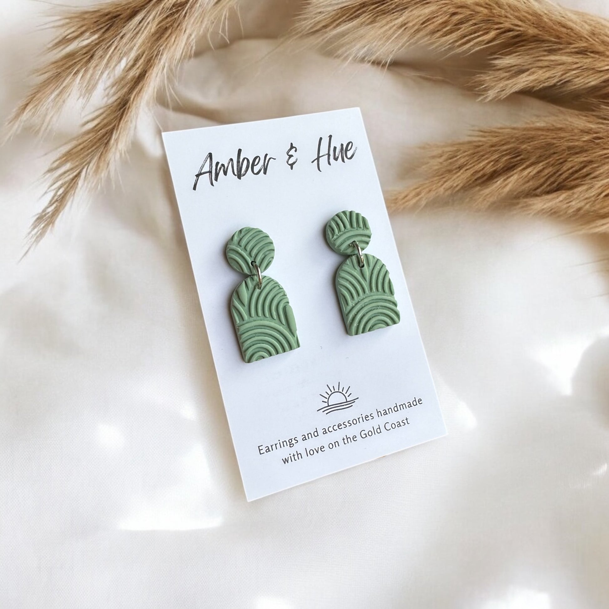 Embrace subtle elegance with our Arch Small Textured Sage Green Dangle Earrings. Each pair is meticulously handcrafted from high-quality polymer clay, showcasing a delicate arch design and a beautifully nuanced light green hue. The unique texture adds a touch of artisan charm, making these earrings a perfect complement to any outfit.