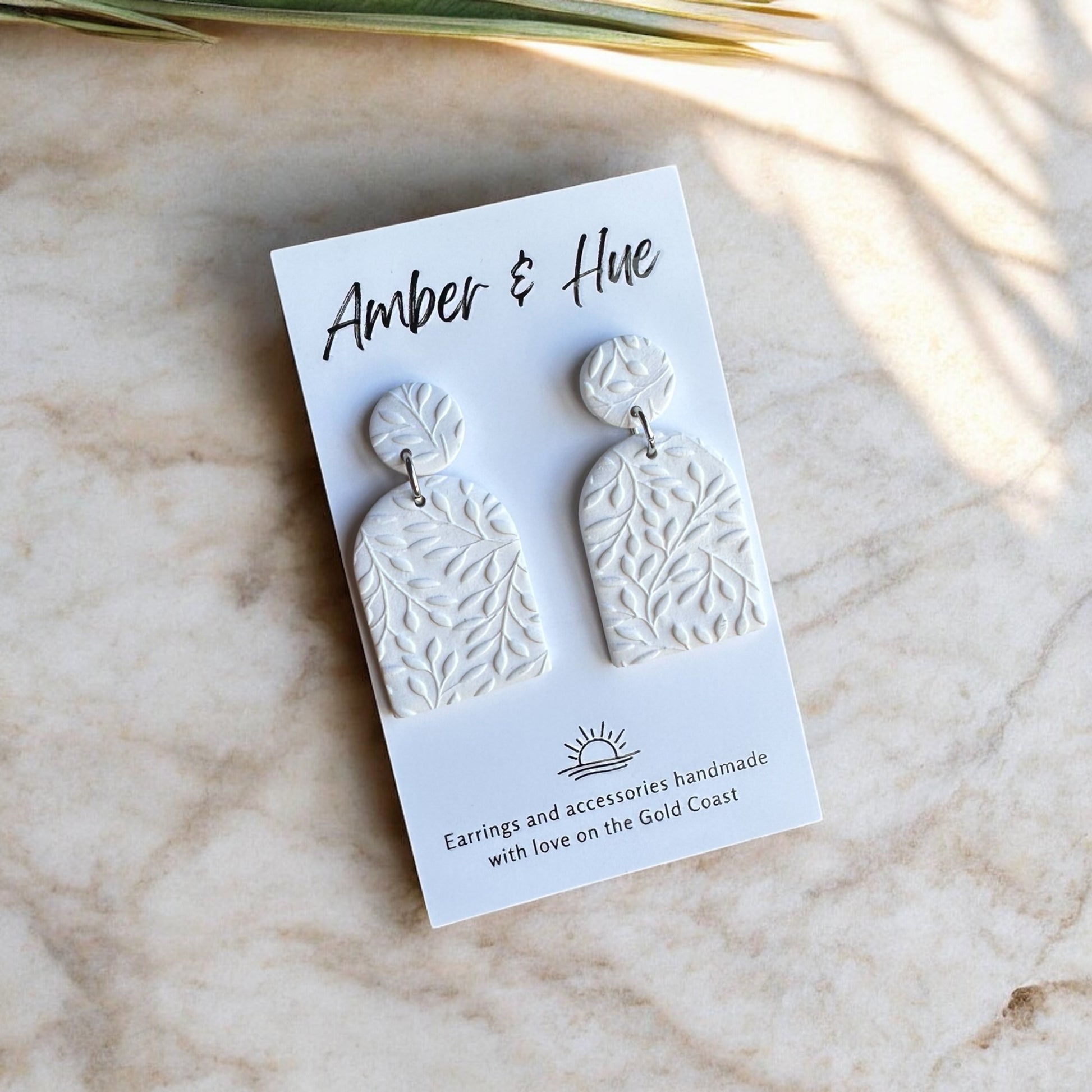 Channel understated sophistication with these captivating arch dangle earrings, handcrafted from polymer clay in a pristine white finish. The clean lines of the arch design are adorned with a delicate leaf imprint, adding a subtle touch of nature's beauty to your everyday look.