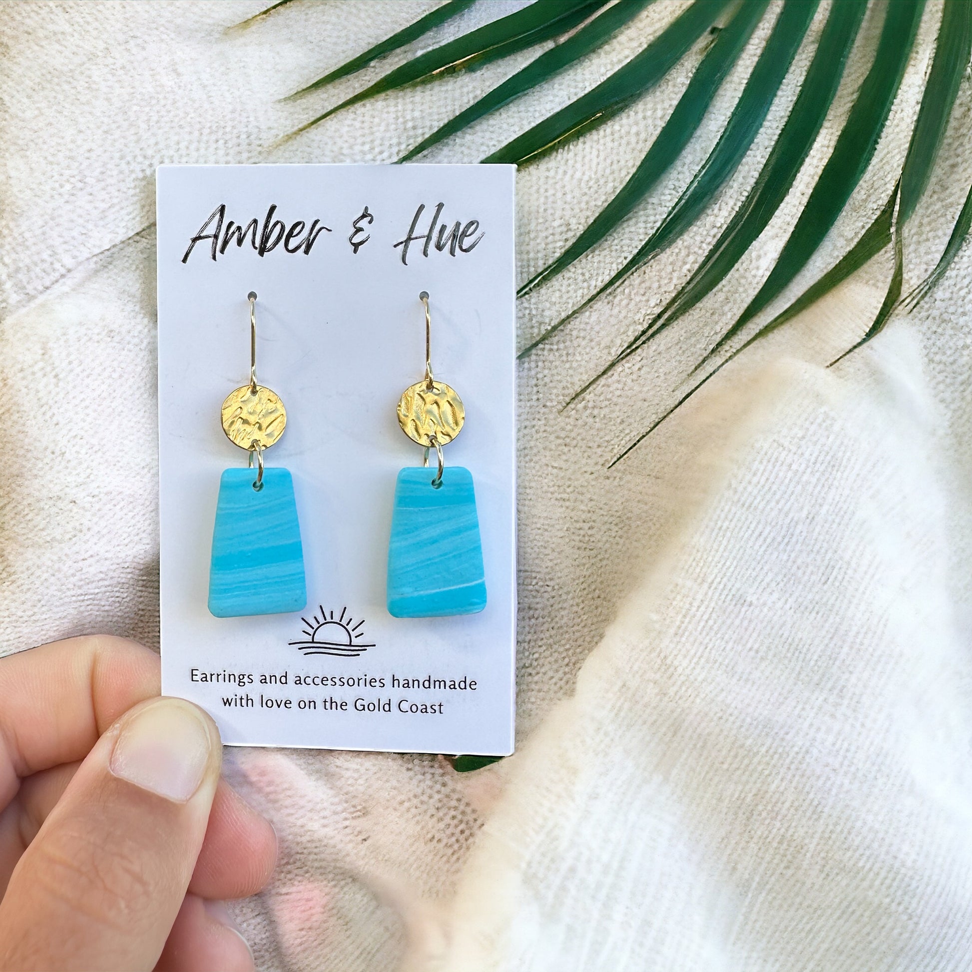 Embrace the captivating allure of the ocean with these mesmerizing aqua and gold hook earrings, meticulously handcrafted from polymer clay. Each pair is a celebration of the ocean's depths, whispering tales of sun-kissed waves and glistening coral reefs.
