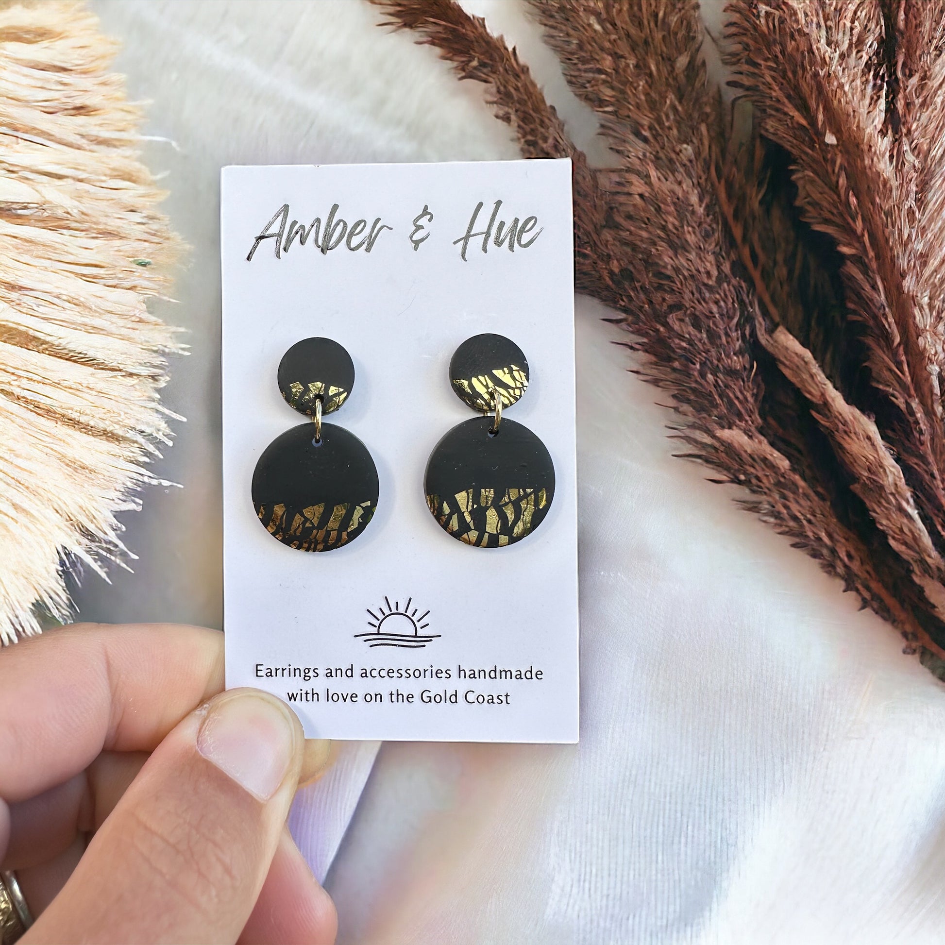 Embrace classic sophistication with these captivating black and gold dangle earrings, meticulously handcrafted from polymer clay. The perfect marriage of bold and beautiful, this timeless combination adds a touch of effortless style to any outfit.
