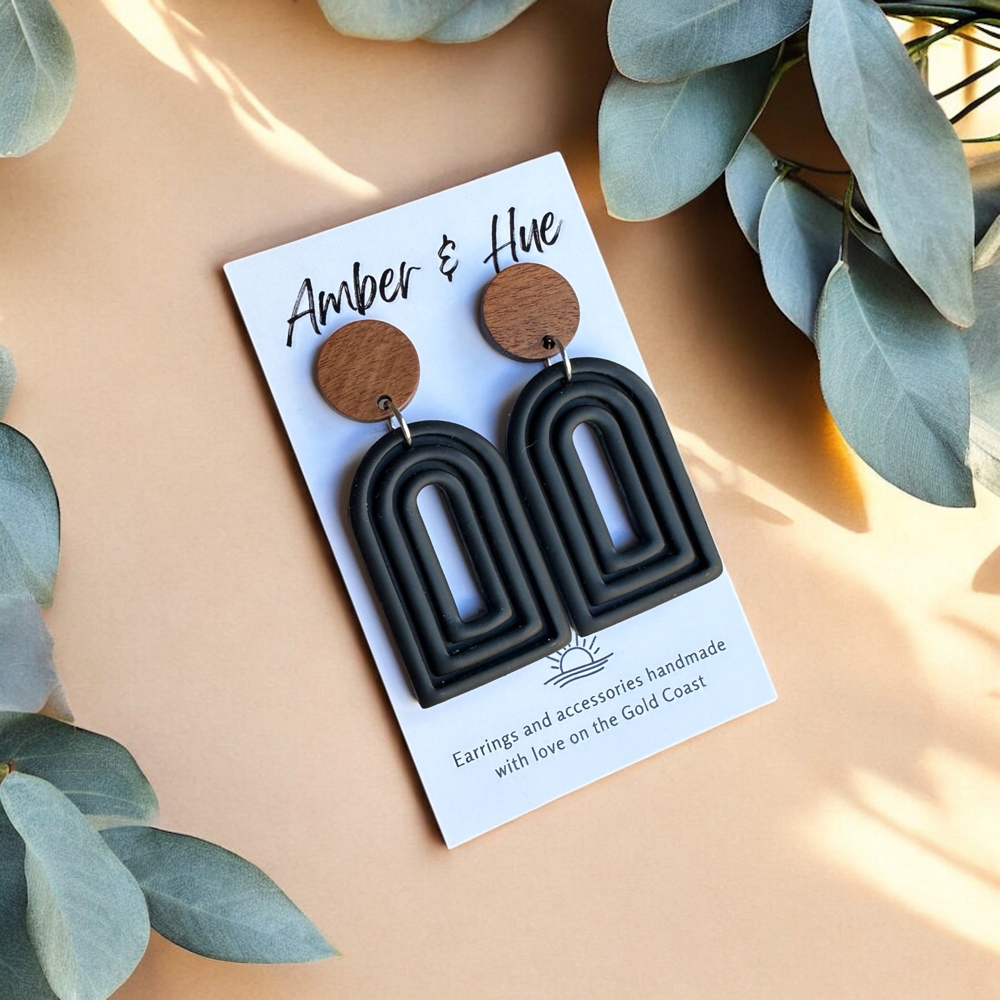 Crafted with a touch of unexpected charm, these black arch dangle earrings offer a unique blend of modern minimalism and natural elegance. They're meticulously handcrafted on the Gold Coast, Australia, using the finest polymer clay and featuring a distinctive wooden stud post.