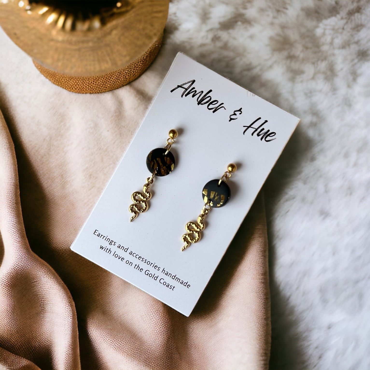 Embrace the Serpent's Allure: Black & Gold Snake Charm Earrings, Handcrafted with Magic