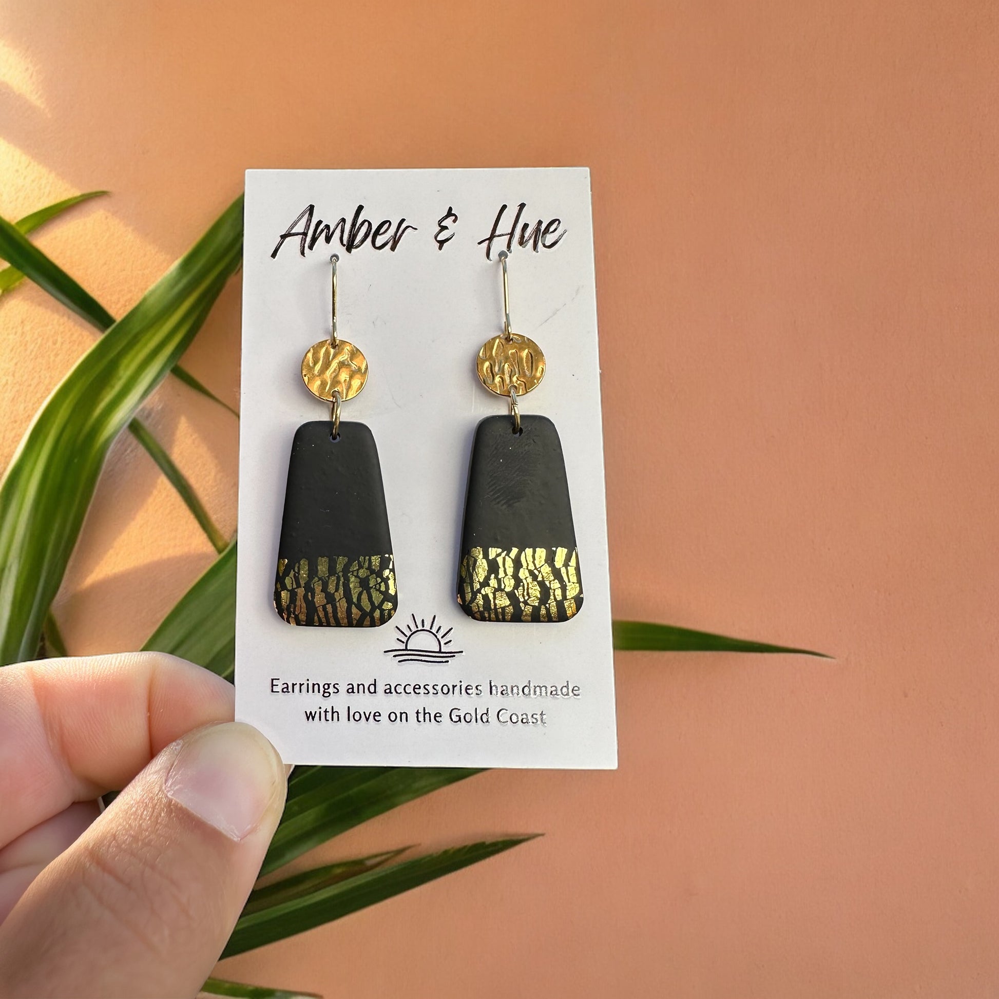 Make a statement with these stunning handmade black and gold disk hook earrings. Crafted from lightweight polymer clay, these earrings offer a unique and eye-catching design perfect for any occasion.