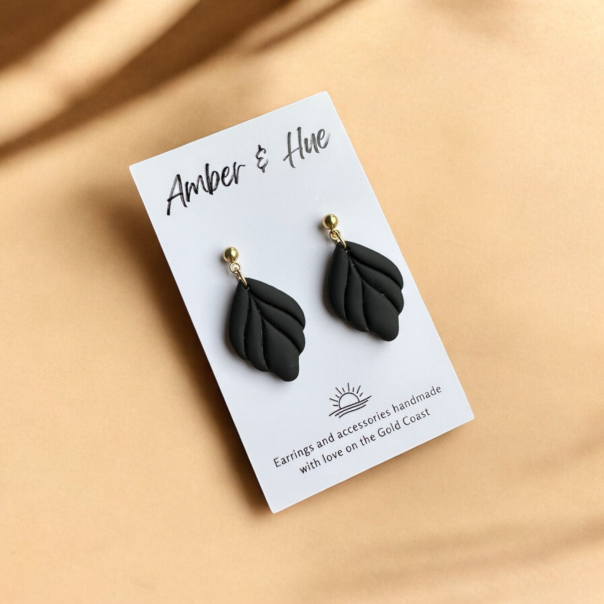 Channel a touch of bold elegance and mysterious allure with these captivating black leaf dangle earrings, meticulously handcrafted from polymer clay. Each piece is a unique celebration of nature's untamed beauty, adding a touch of sophisticated edge to your everyday look.