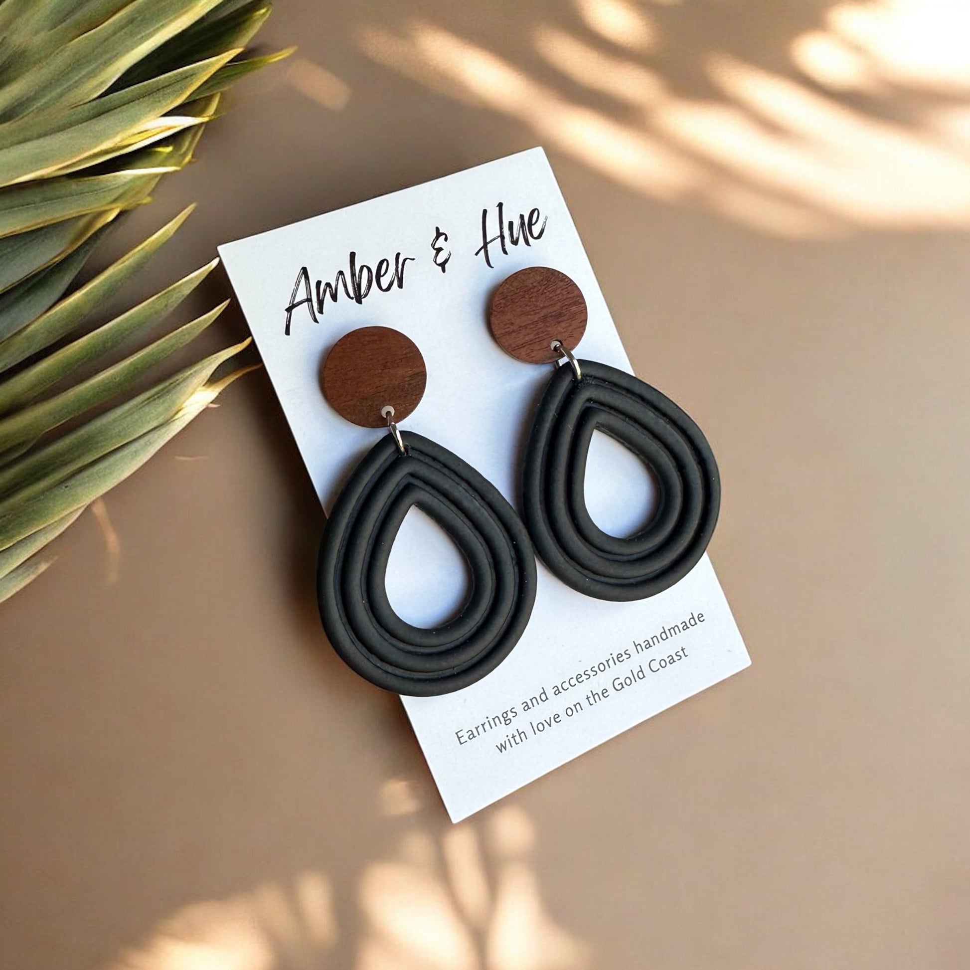 Embrace Bold Elegance: Black Teardrop Dangle Earrings with Wooden Stud Posts