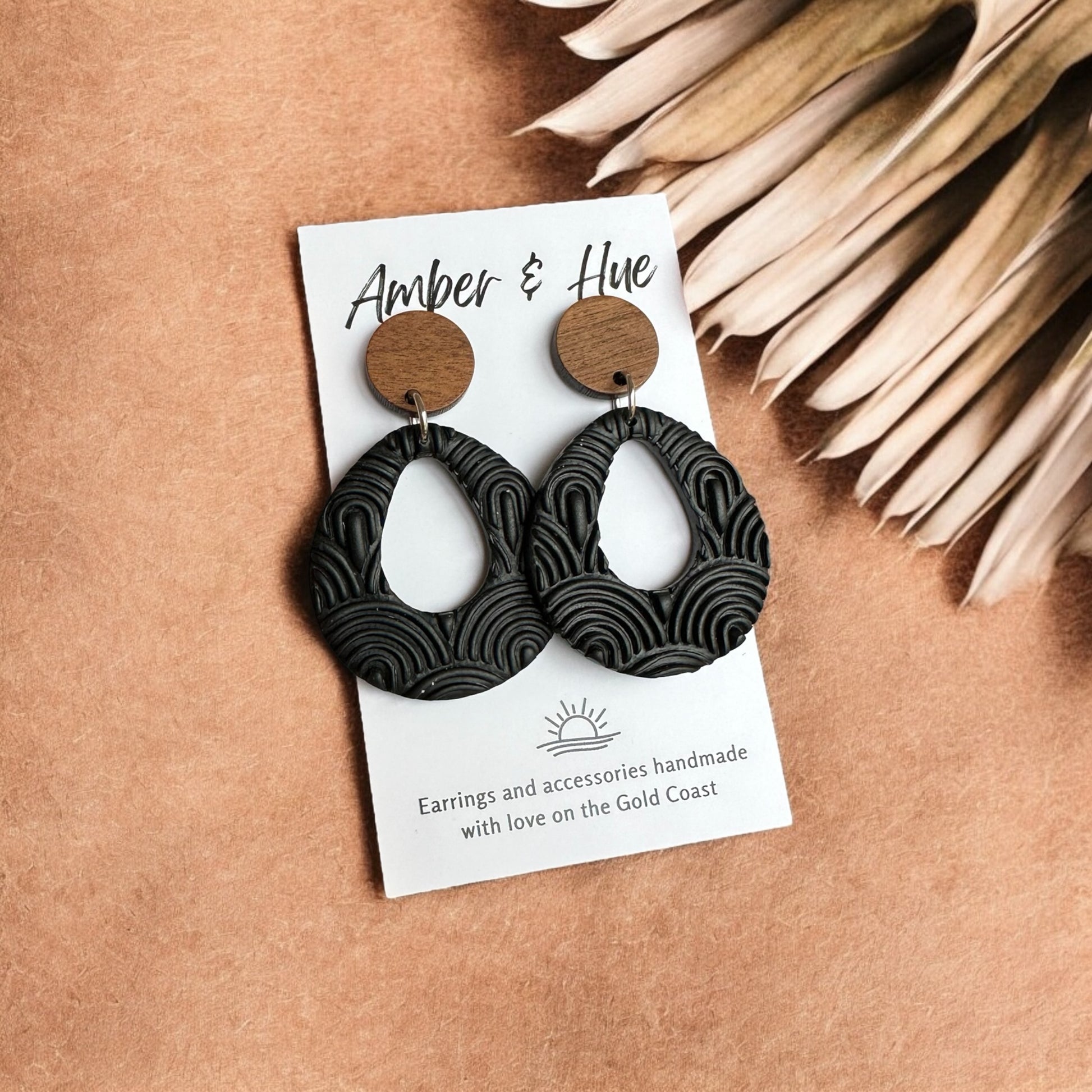 Discover the unique blend of modern design and natural charm with our handcrafted Black Teardrop Textured Earrings. Each pair is meticulously crafted from lightweight polymer clay, offering a striking statement without weighing you down.
