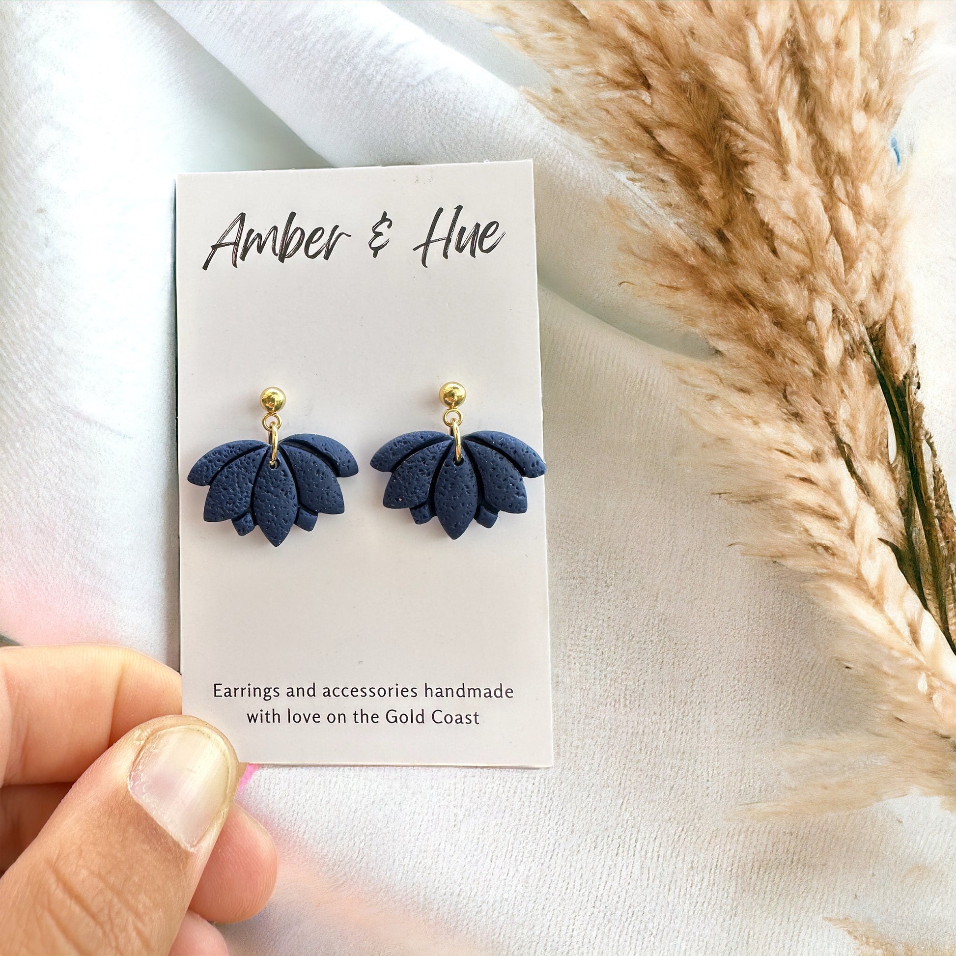 Embrace the serenity of a blooming lotus with these captivating blue navy dangle earrings, meticulously handcrafted from polymer clay. Each piece is a unique symbol of peace and rebirth, adding a touch of calming elegance to your everyday look.
