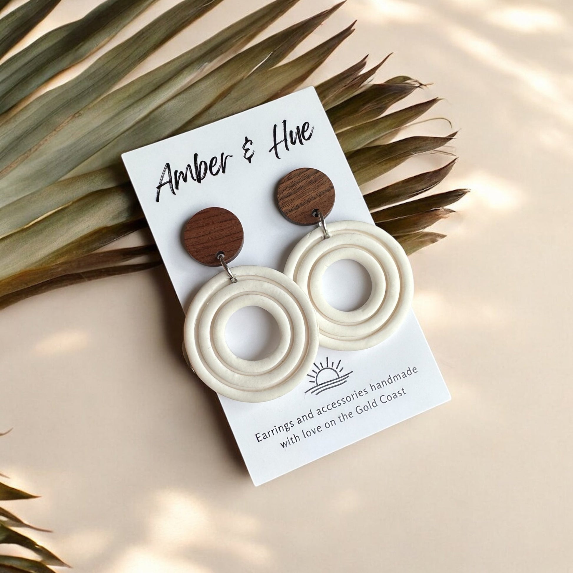 Embrace the beauty of minimalist elegance with these captivating white circle dangle earrings, meticulously handcrafted from polymer clay and featuring unique wooden stud posts. This timeless design adds a touch of effortless sophistication and natural charm to any outfit.