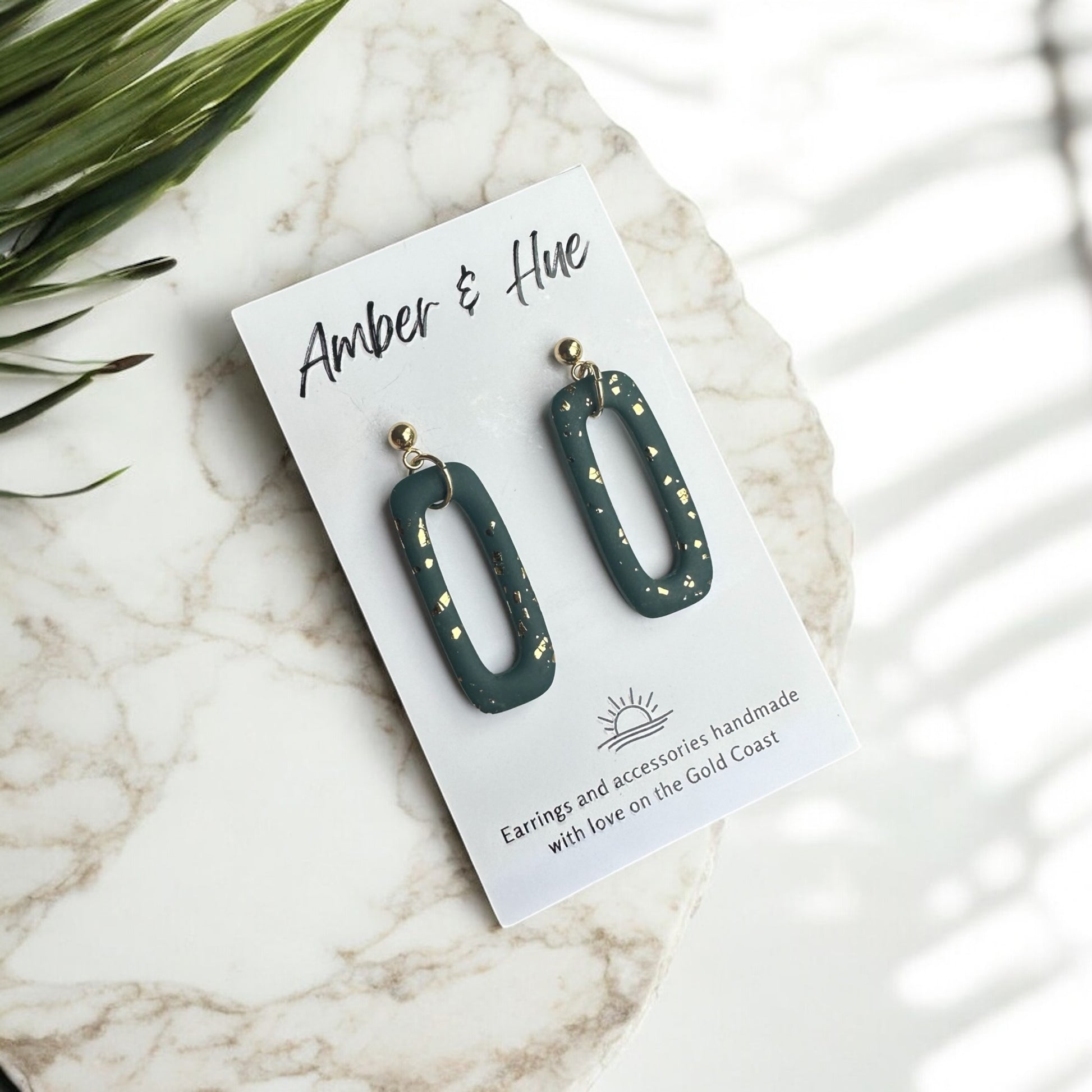 These stunning earrings feature a deep, rich bottle green hue that beautifully complements the delicate sparkle of shimmery gold, creating a captivating contrast. The rounded rectangle shape provides a modern yet timeless appeal, making them versatile enough for both everyday wear and special occasions.