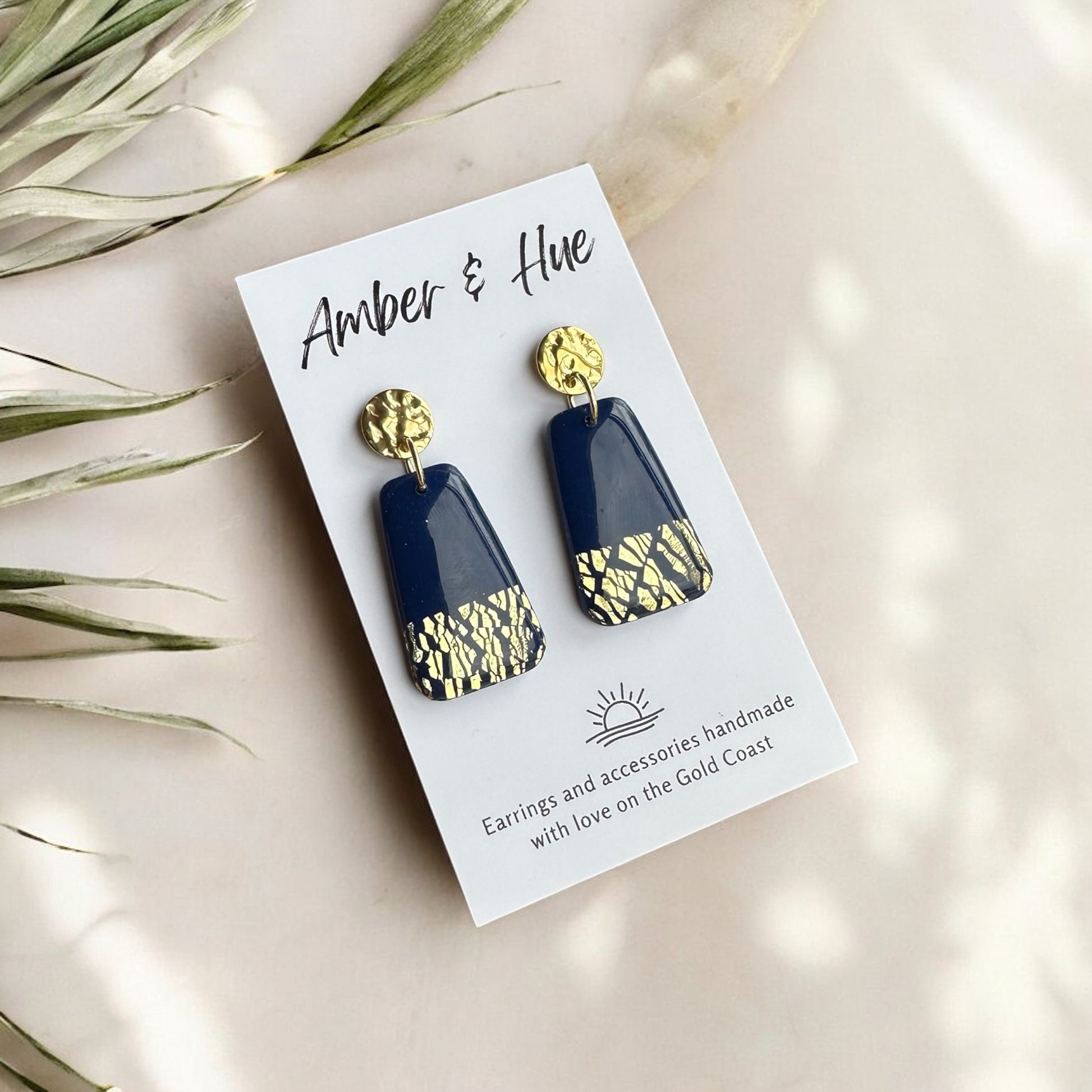 Add a touch of handcrafted luxury to your jewellery collection with our Deep Navy Blue and Gold Gloss Dangle Earrings – a true wearable work of art!