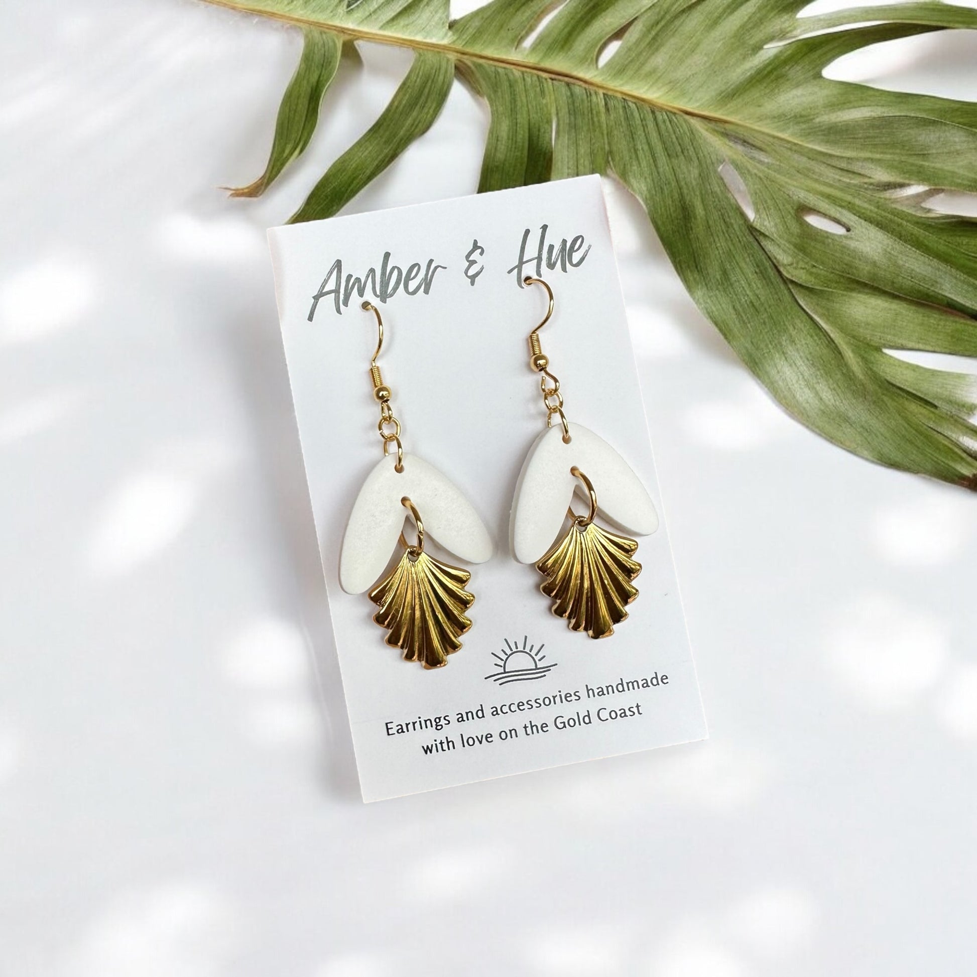 Elegant Charm White and Gold Hook Earrings - Handcrafted Polymer Clay Art