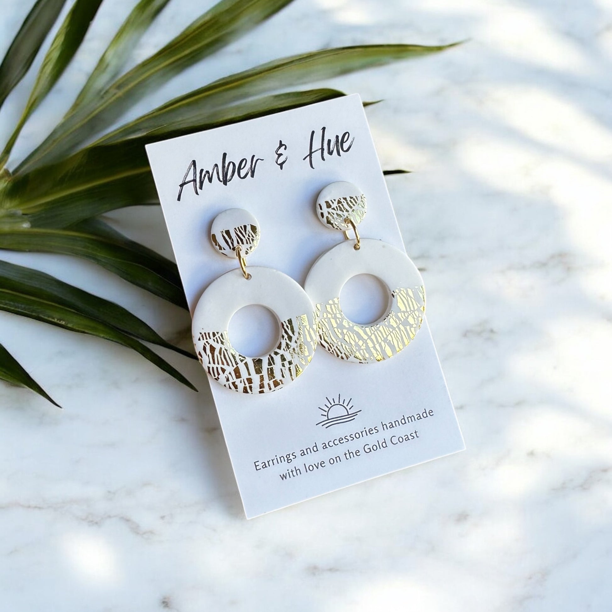 Embrace classic beauty with these captivating white and gold dangle earrings, meticulously handcrafted from polymer clay. The combination of a pristine white base and shimmering gold accents creates a timeless piece that elevates any outfit with effortless grace.