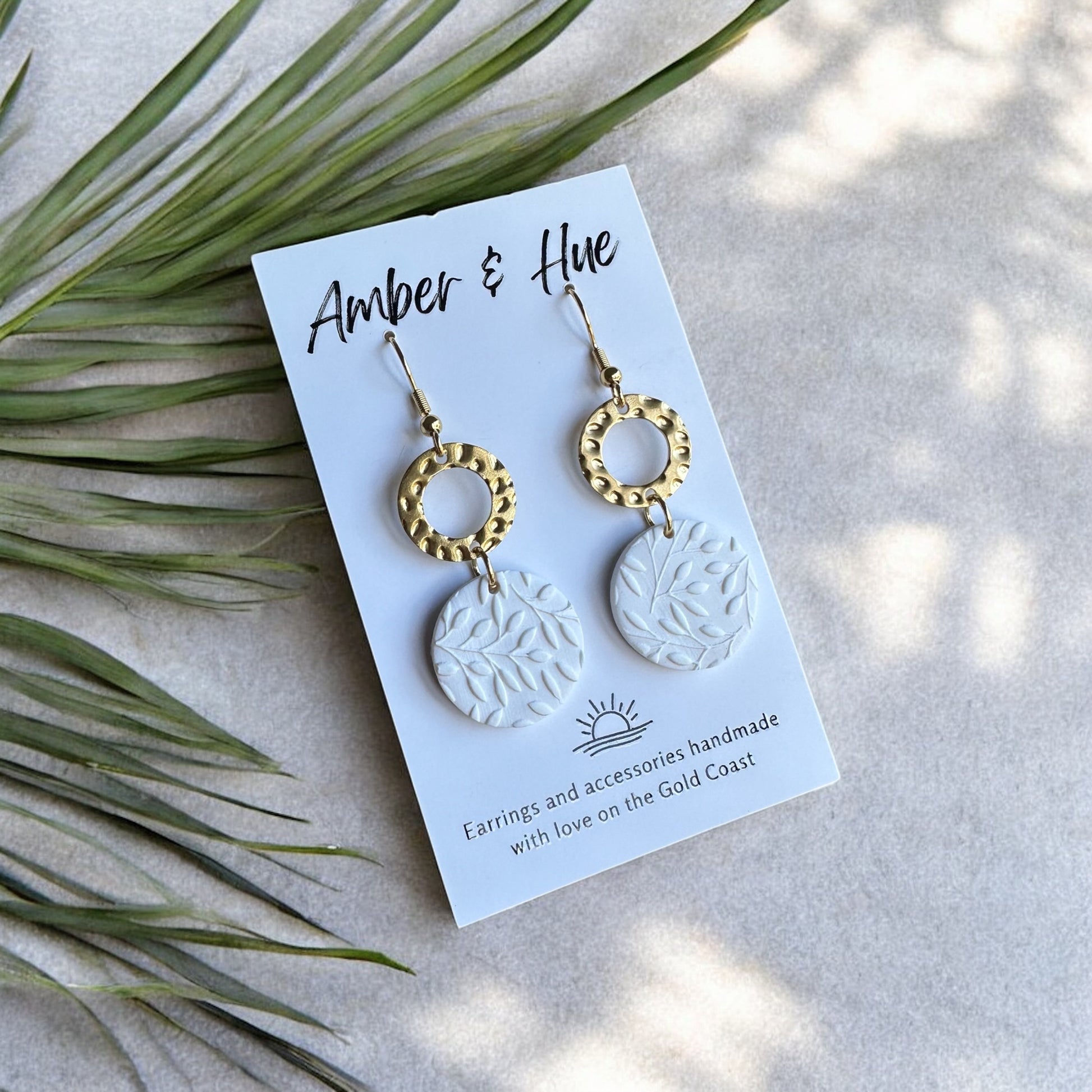 Effortless Elegance: White and Gold Leaf Print Hook Earrings, Handcrafted in Polymer Clay