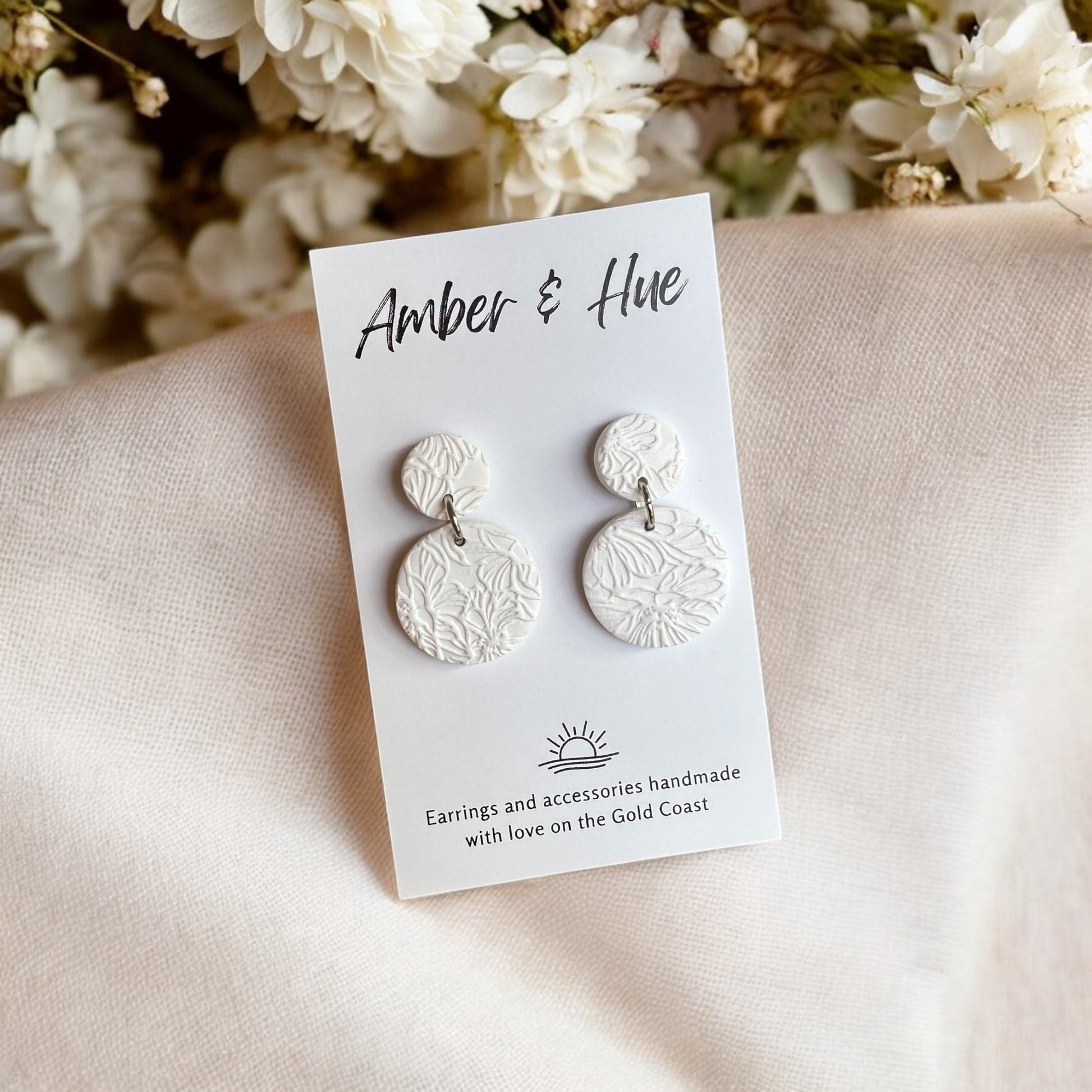 Embrace timeless elegance with these captivating white dangle earrings, handcrafted from polymer clay and featuring a mesmerizing floral imprint. Each piece is a whisper of springtime, adding a touch of delicate beauty to your everyday look.