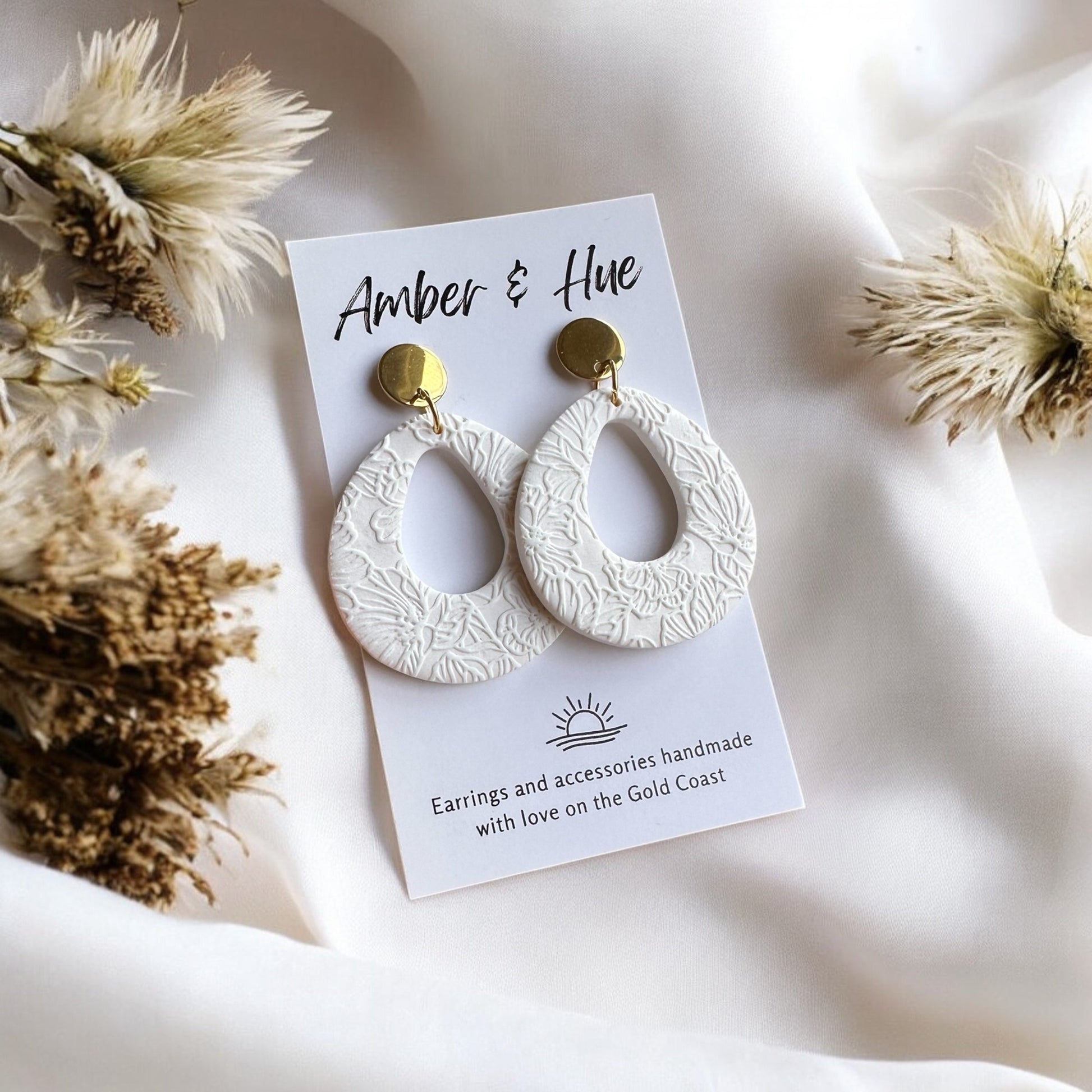 Adorn your ears with a touch of nature's beauty and artisanal charm. These exquisite Flower Imprint White Round Teardrop Dangle Earrings are meticulously handcrafted from high-quality polymer clay, ensuring a lightweight and comfortable wear.