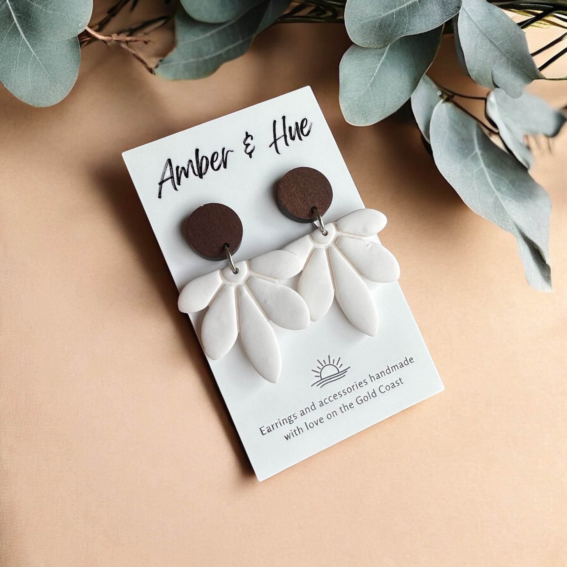 Embrace a touch of understated beauty with these captivating white flower dangle earrings, handcrafted from polymer clay and featuring natural wood accents. This elegant combination of classic design and organic elements creates a timeless piece that complements any outfit.