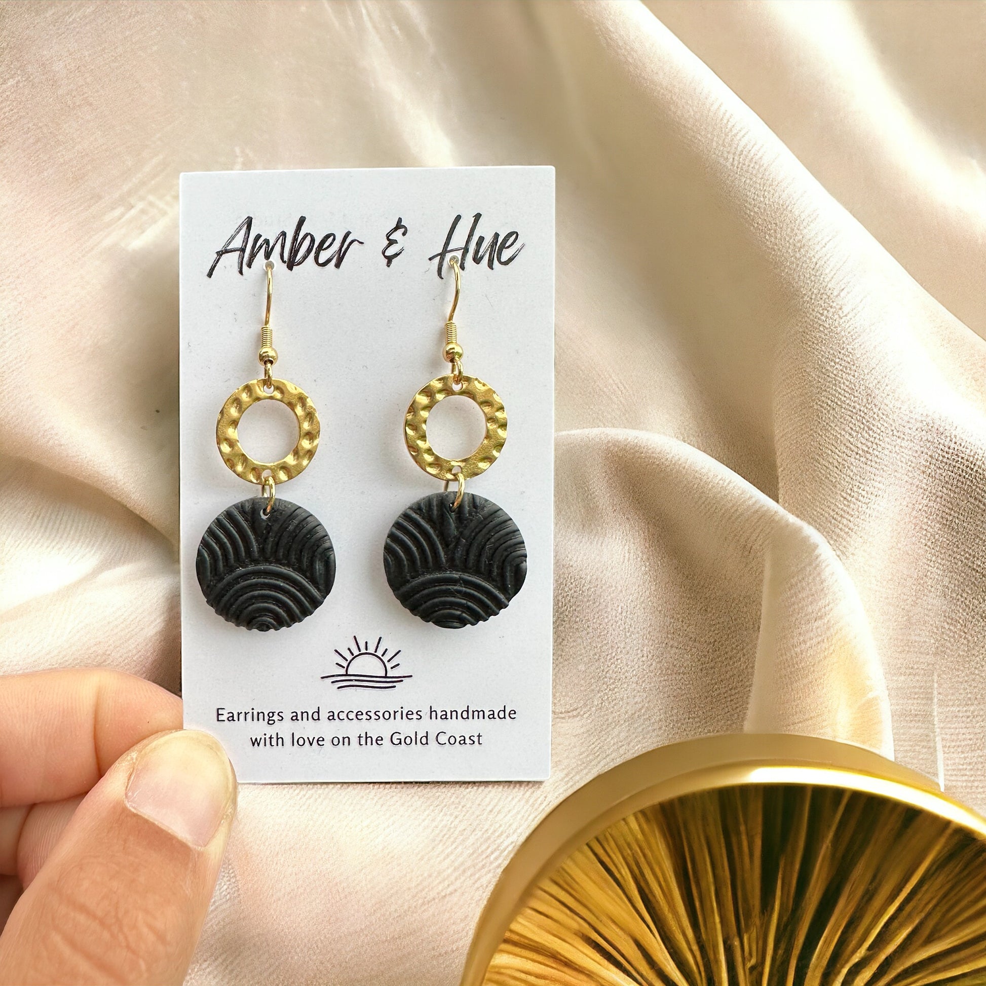 Embrace timeless sophistication with these captivating black and gold dangle earrings, handcrafted from polymer clay. The sleek design and classic color combination exude an air of effortless elegance, making them a perfect complement to any outfit.