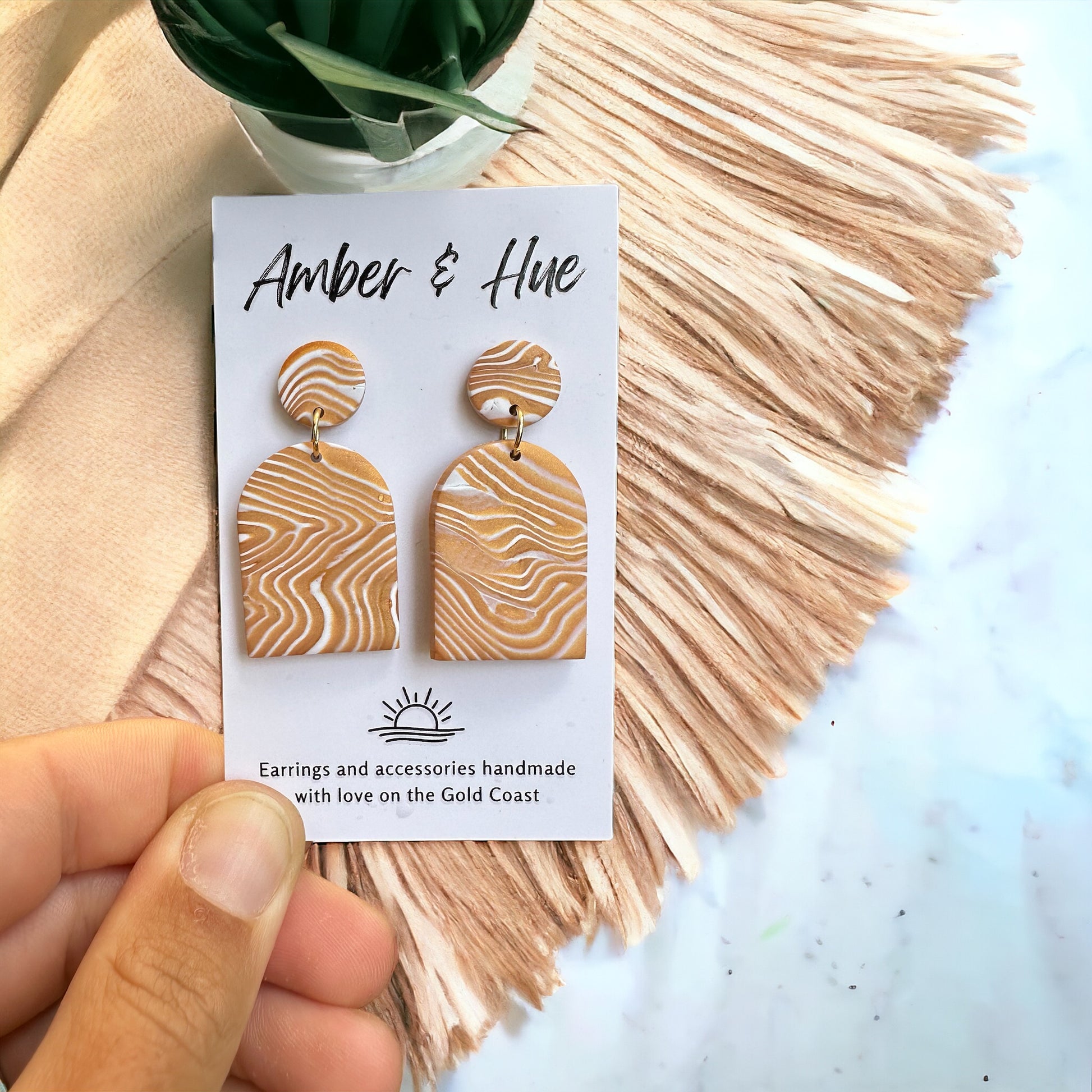 Channel the warmth of the Gold Coast with these captivating Golden Sands Arch Dangle Earrings, meticulously handcrafted from polymer clay. Each piece evokes the gentle curve of a sun-drenched sand dune, adding a touch of coastal charm and timeless elegance to your everyday look.