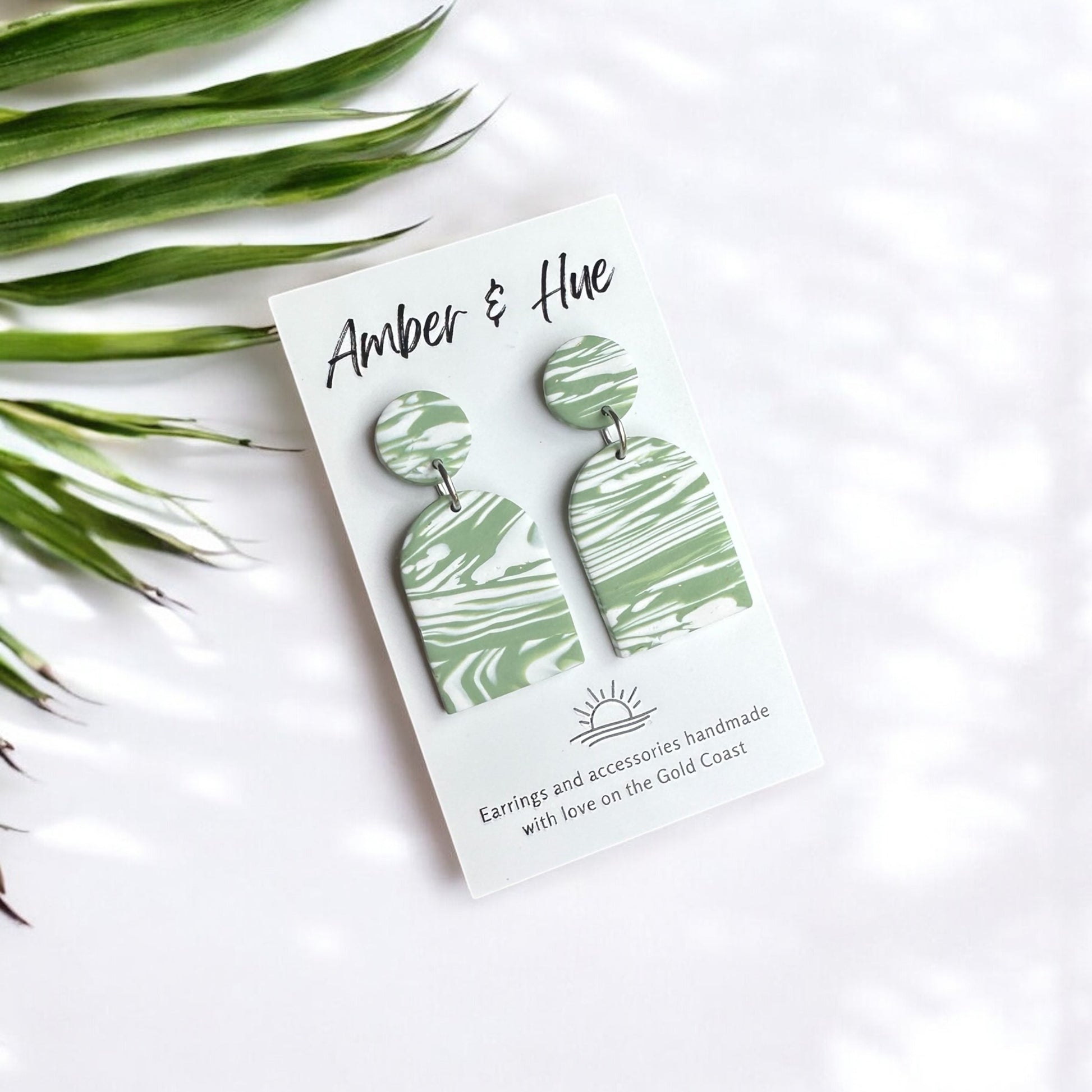 Embrace Modern Minimalism: Sage Green & White Arch Dangle Earrings, Handmade from Polymer Clay