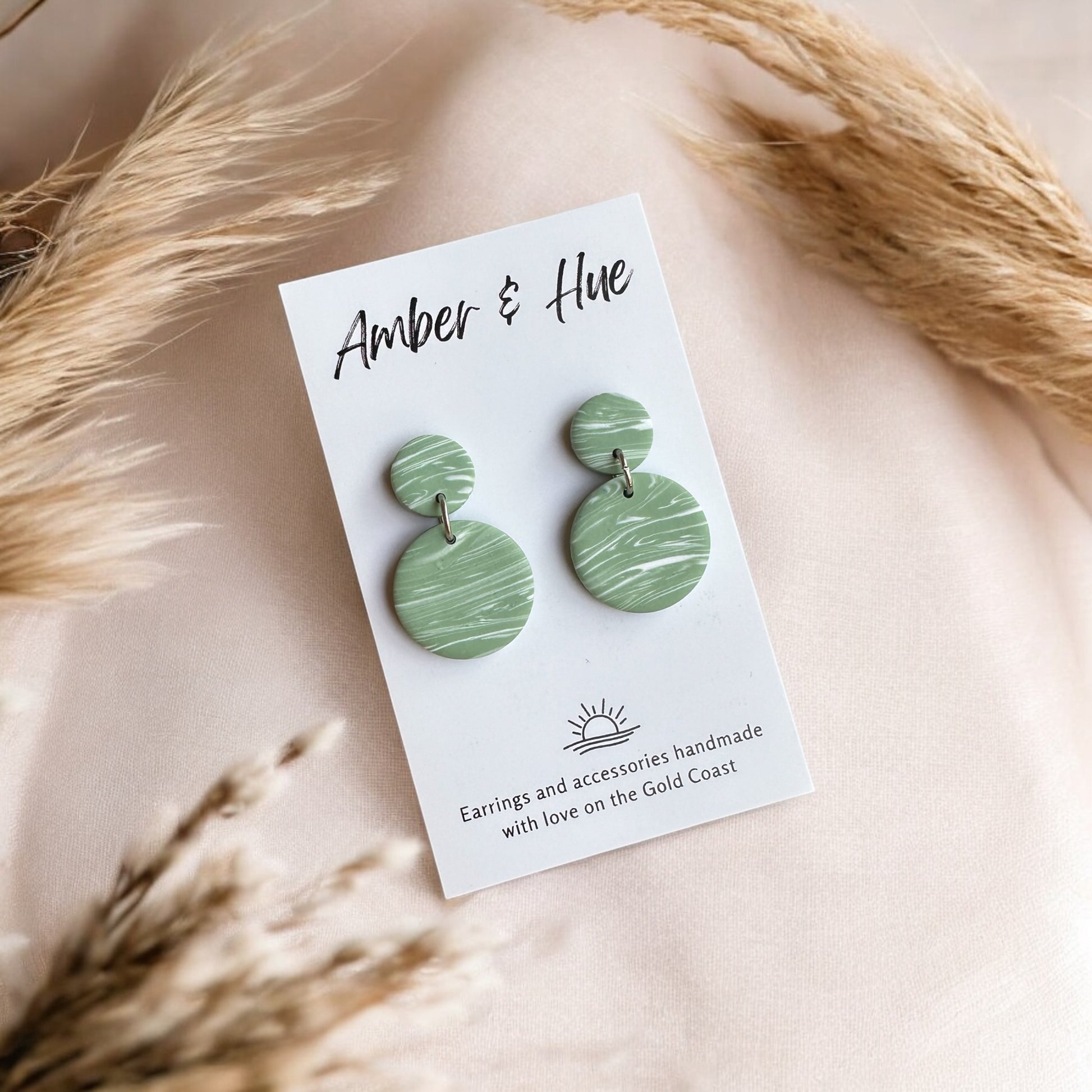 Embrace a touch of organic elegance with these handcrafted Sage Green and White Marbled Small Round Dangle Earrings. Each pair is meticulously created from polymer clay, featuring a unique, swirling marble pattern of serene greens and crisp whites.