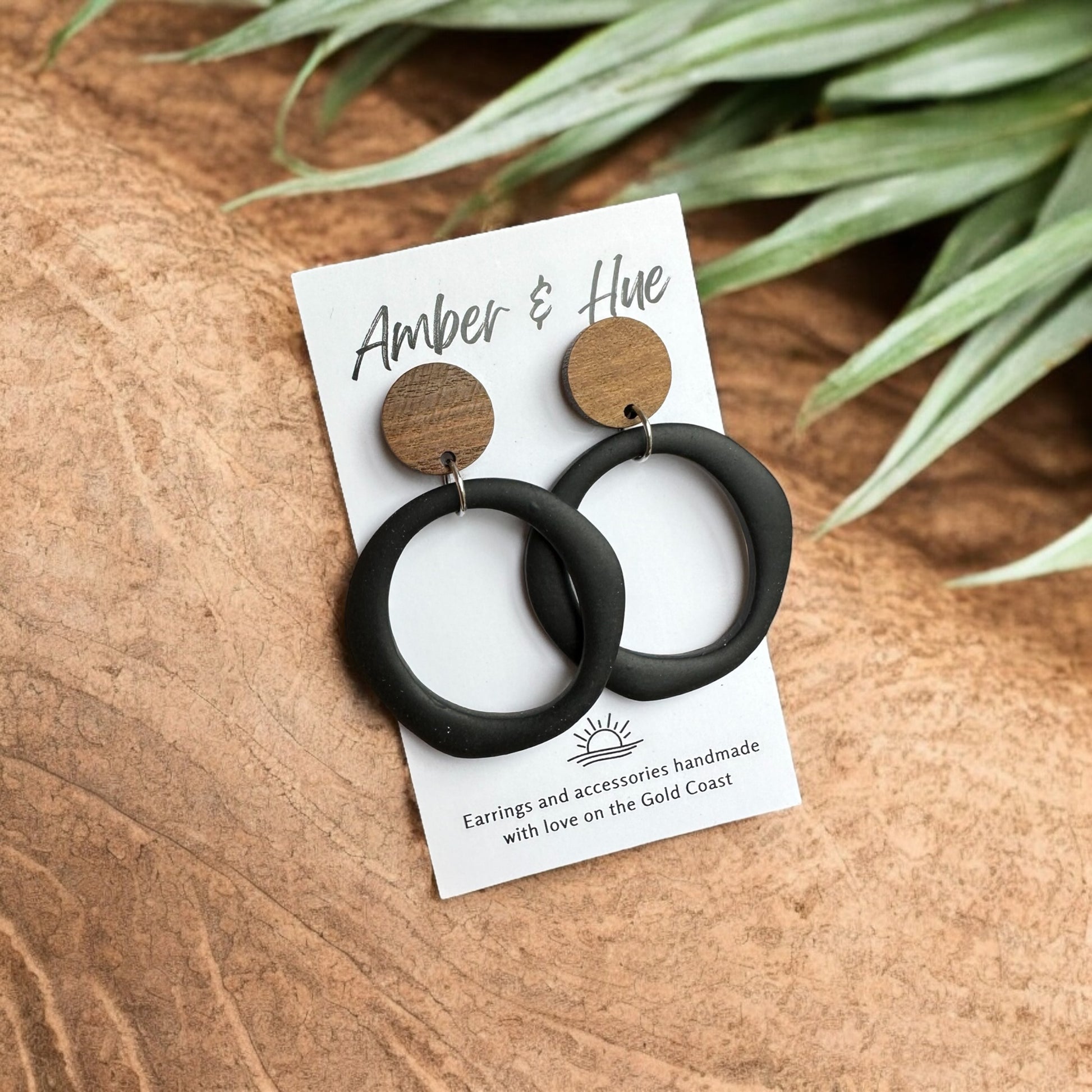 Large Black Hoop Dangle Earrings with a Wooden Stud Post