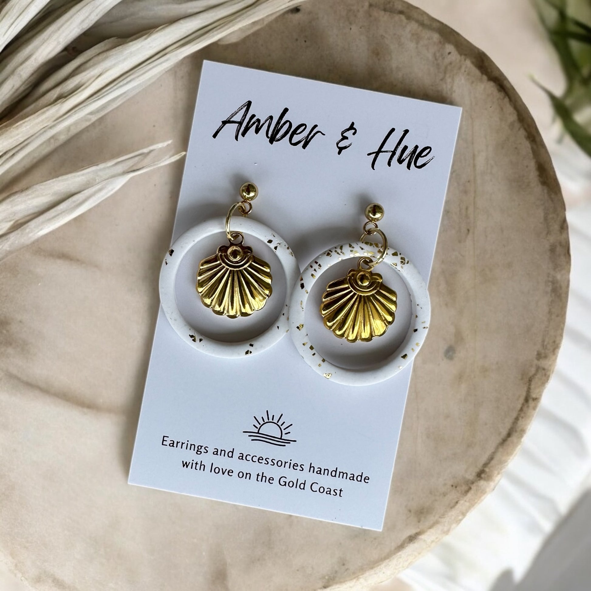 Embrace the serene beauty of the ocean with our stunning Large Gold Seashell and White Hoop Earrings. Each pair is meticulously handcrafted from lightweight polymer clay, offering a unique and artistic touch to your jewelry collection.