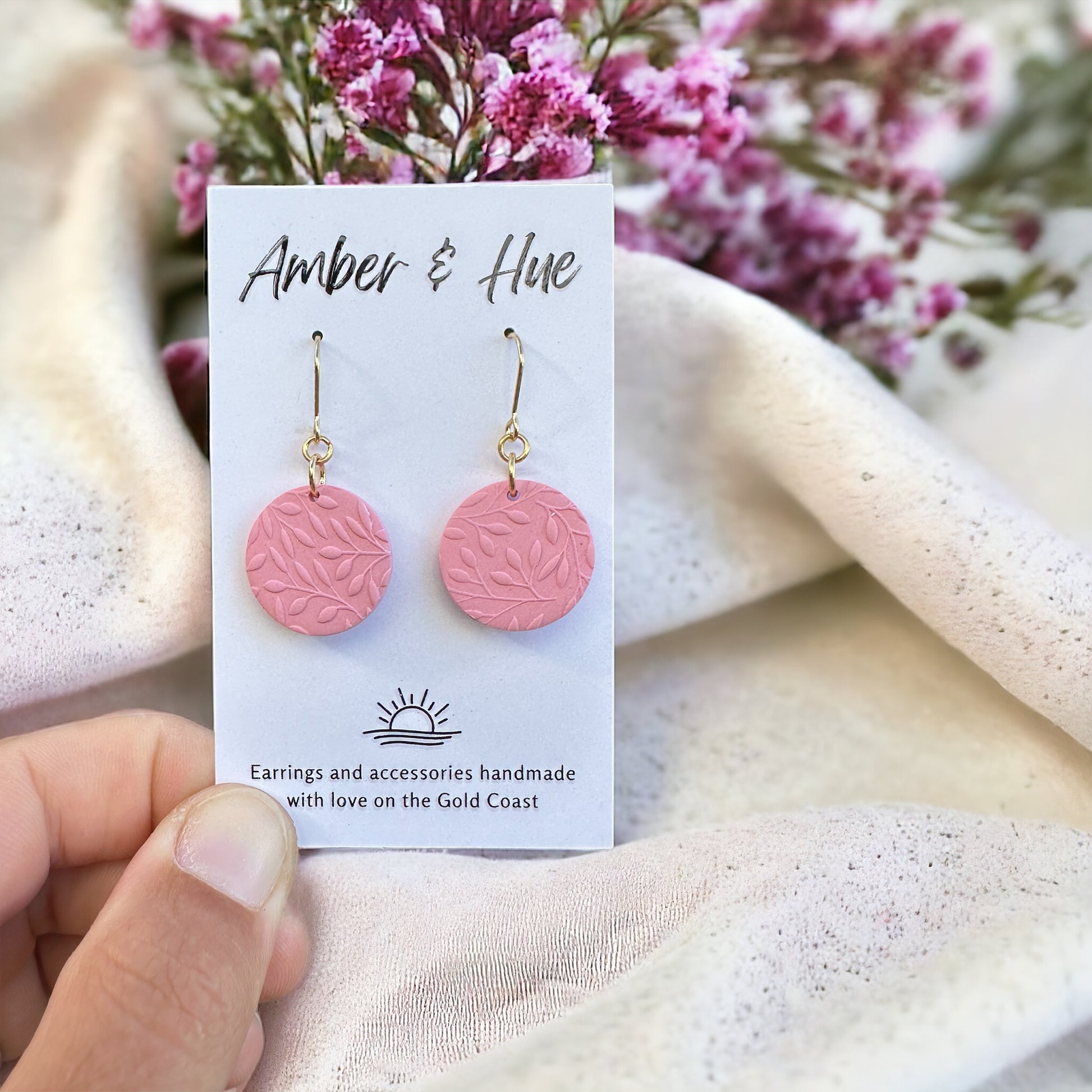 Embrace the subtle charm of nature with these captivating soft pink hook earrings, handcrafted from polymer clay and adorned with a delicate leaf print. Each pair is a celebration of springtime's gentle touch, adding a touch of whimsical elegance to your everyday look.