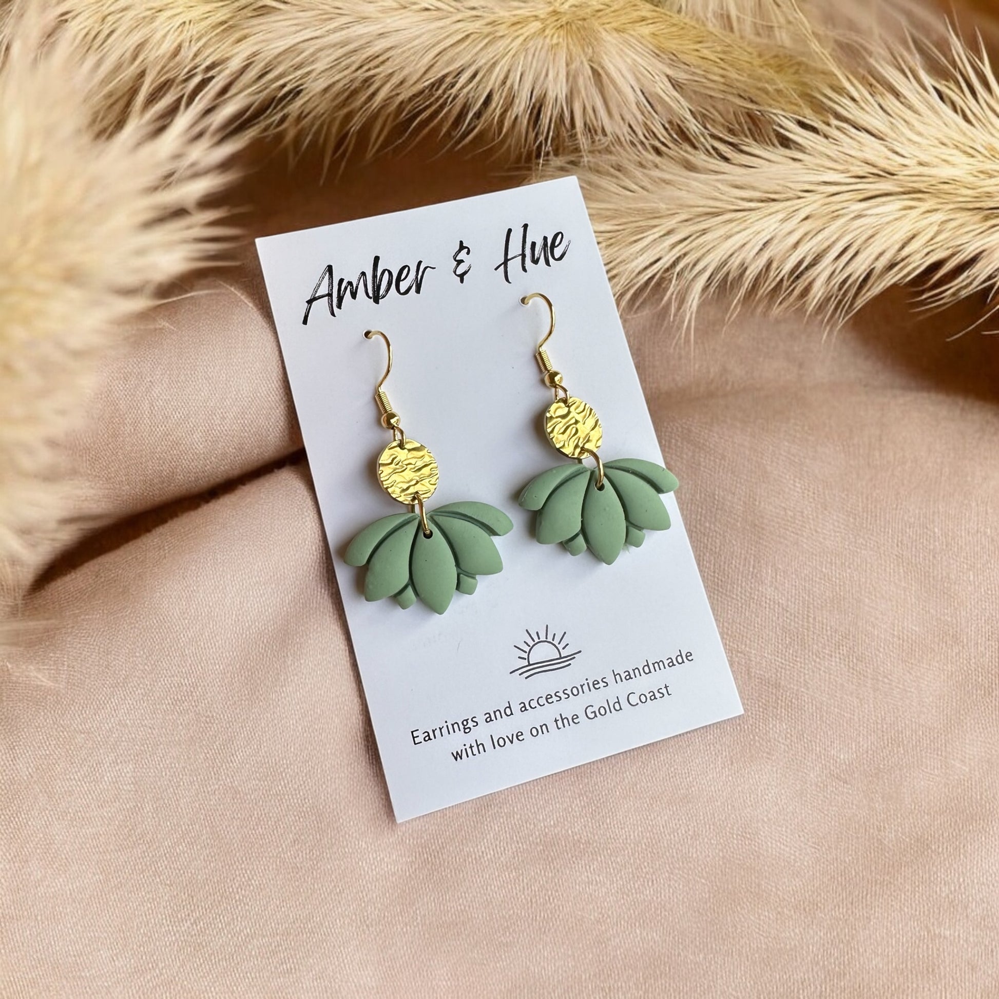 Embrace serene elegance with our handcrafted Sage Green and Gold Lotus Hook Earrings. Each pair is meticulously sculpted from premium polymer clay, capturing the delicate beauty of the lotus flower in a captivating blend of soft light green and shimmering gold accents.