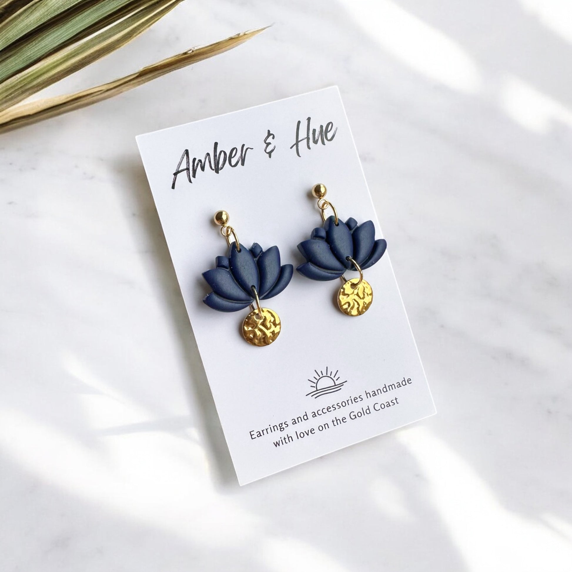 Elevate your everyday style with our exquisite Navy Blue Lotus and Dainty Gold Disk Dangle Earrings, lovingly handcrafted from lightweight polymer clay. These unique earrings blend a serene aesthetic with a touch of modern elegance, making them the perfect accessory for any occasion.