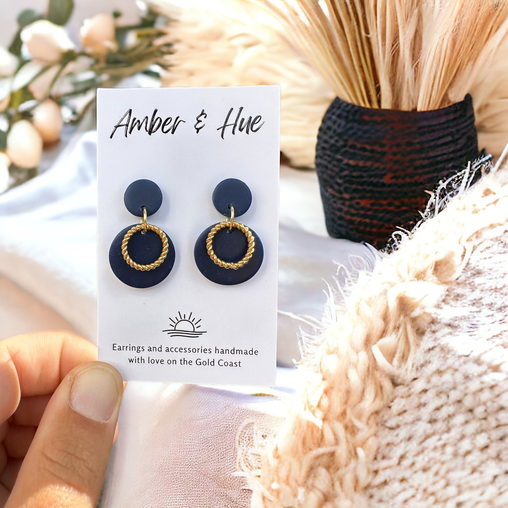Timeless Elegance: Navy & Gold Circle Dangle Earrings, Handcrafted in Polymer Clay