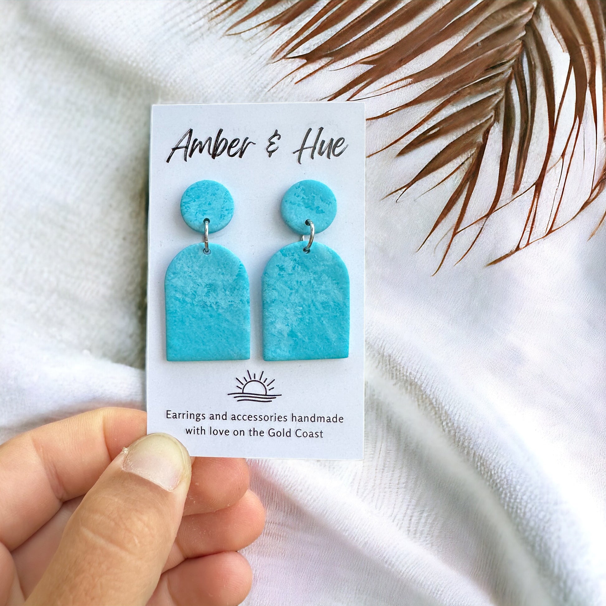 Embrace the calming allure of the ocean with these mesmerizing aqua arch dangle earrings, lovingly handcrafted from polymer clay. Each piece is a unique ode to the underwater world's beauty, adding a touch of serene elegance and coastal charm to your everyday look.
