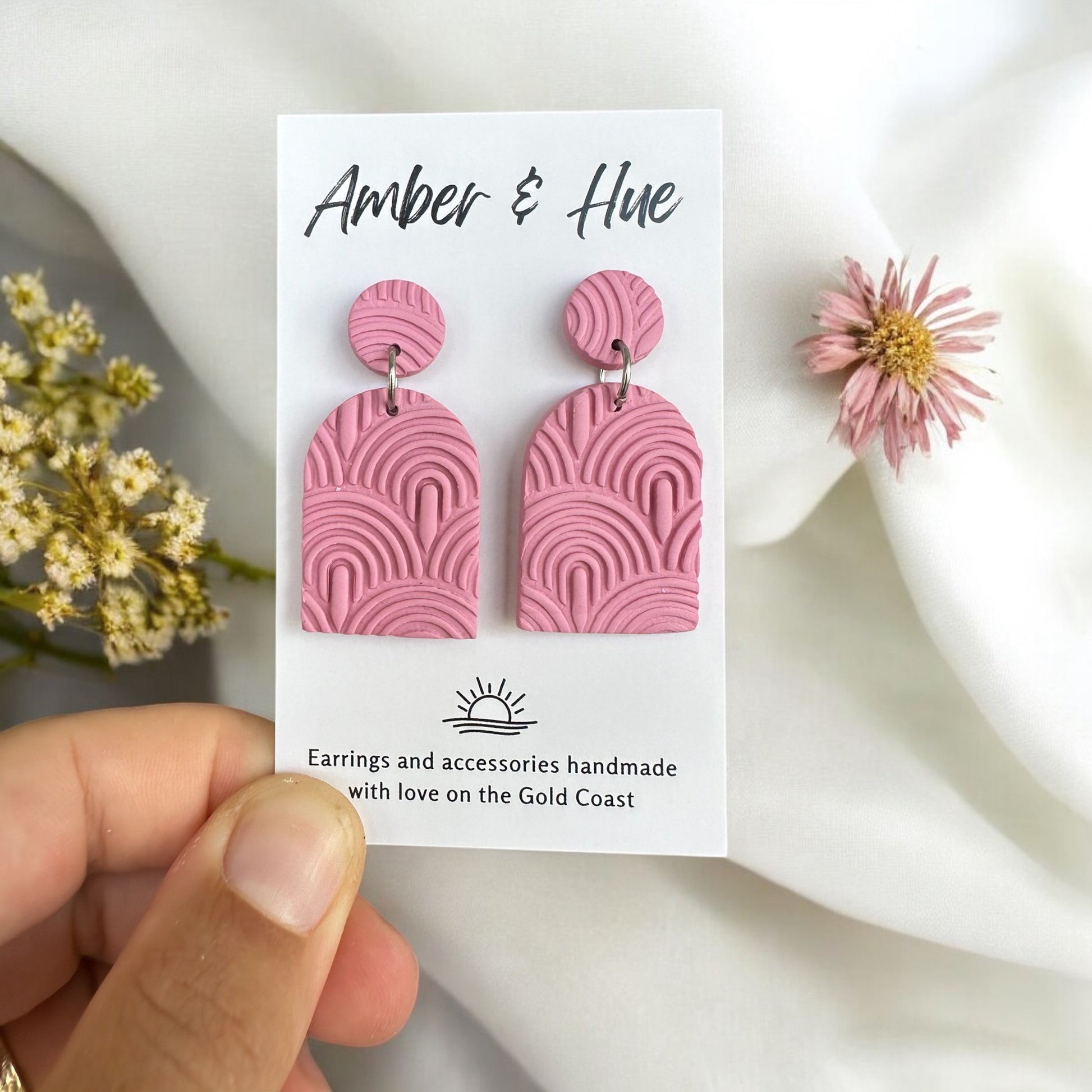 The earrings feature a pink arch shape with a textured surface, adding depth and dimension. The delicate arch hangs gracefully, creating a modern and stylish look.