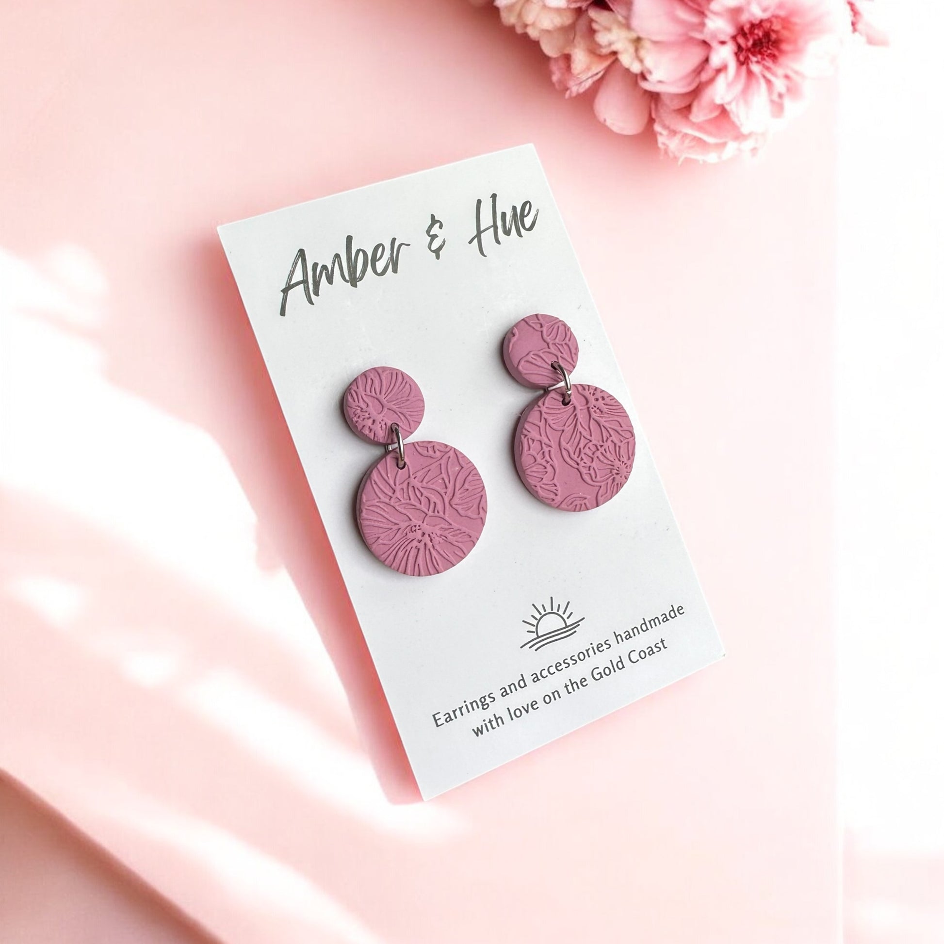Indulge in the delicate charm of our Mauve Pink Round Floral Imprint Dangle Earrings, meticulously handmade from lightweight polymer clay. Each earring features a beautifully imprinted floral design, capturing the essence of a blossoming garden in a soft, versatile pink hue.