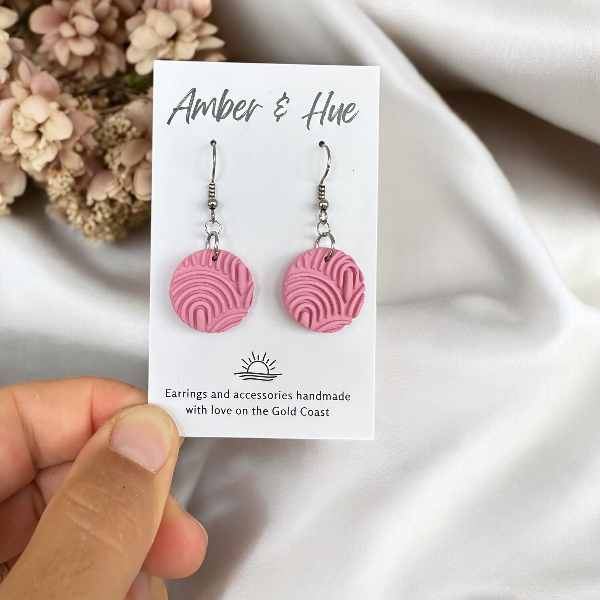 The round earrings are a soft shade of pink with a textured surface, adding a touch of sophistication and charm. The lightweight design, combined with hypoallergenic hooks, ensures all-day comfort.