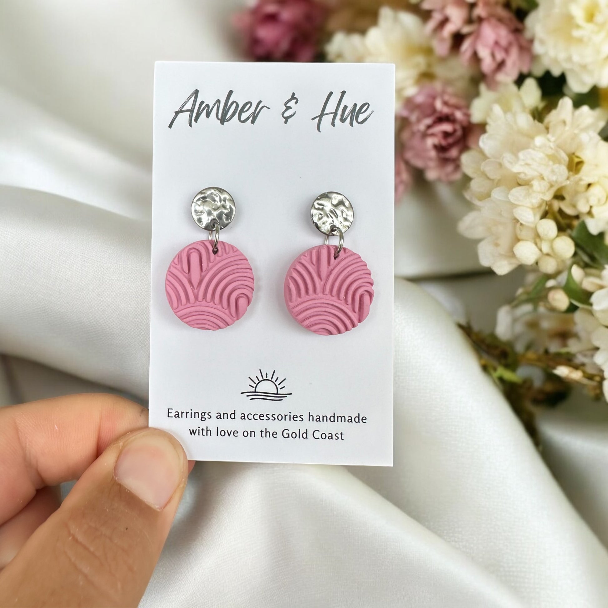 These stunning earrings are handcrafted with love using high-quality polymer clay. The earrings feature a soft pink hue with a textured surface, adding depth and visual interest. A dainty silver stud post completes the look, creating a minimalist and modern aesthetic.