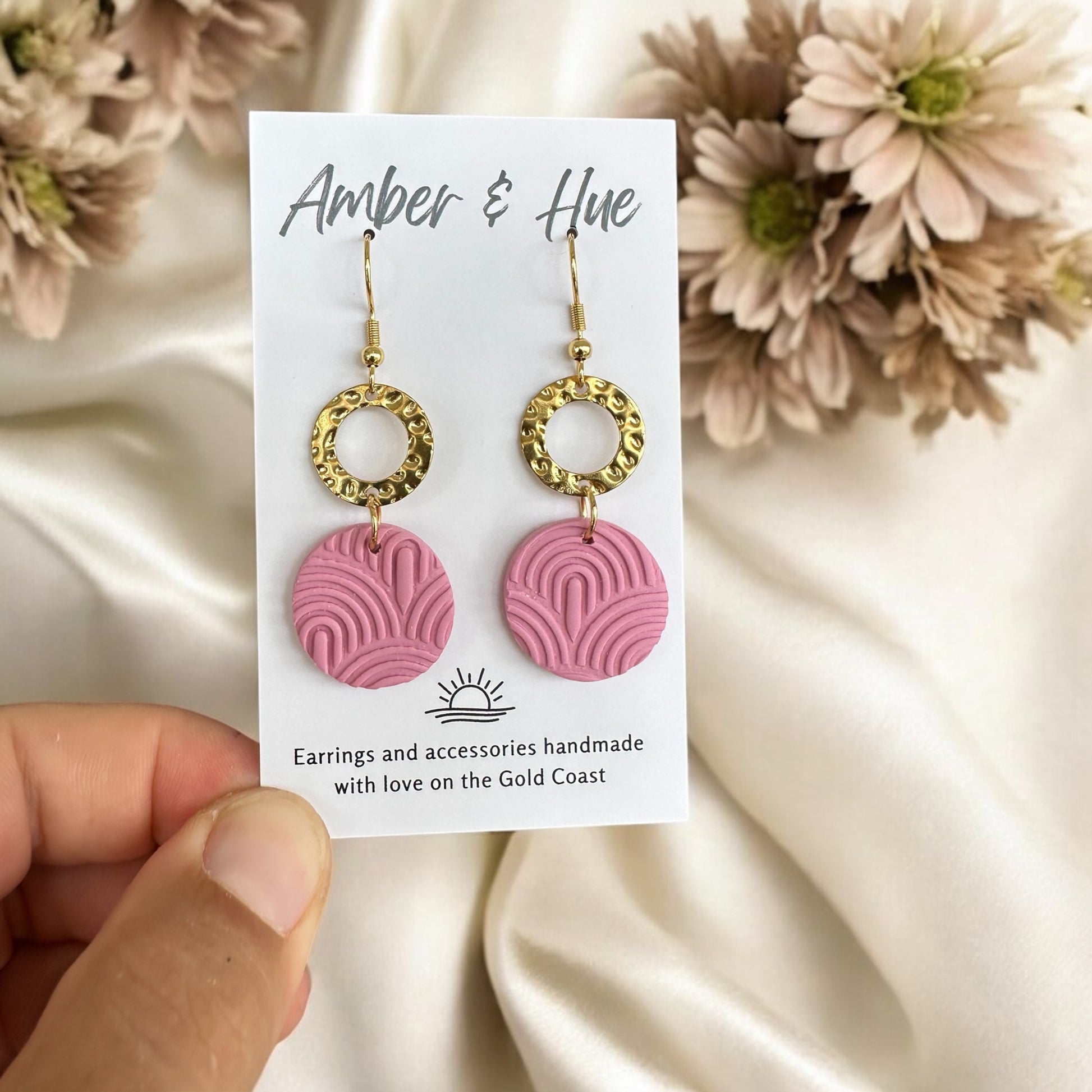 Pink Textured Round Hook Earrings With Gold Dainty Circle