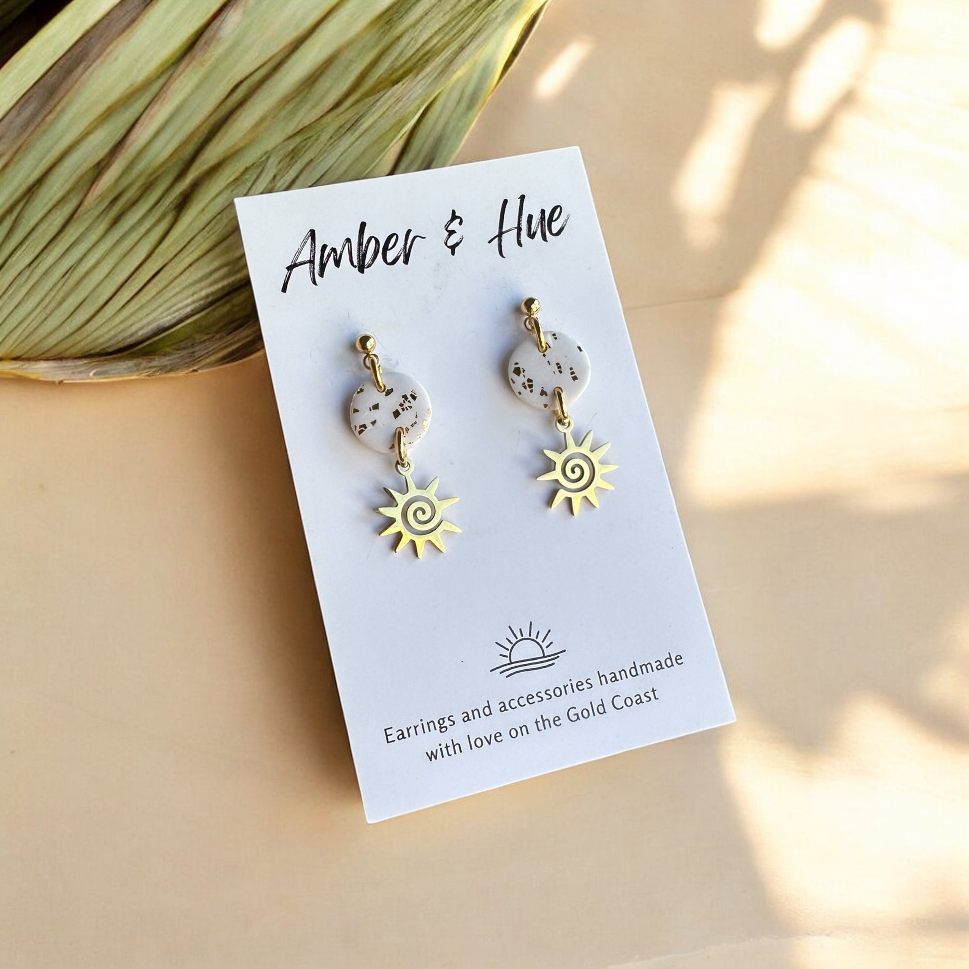 Embrace the warmth of the Australian sun with these captivating white and gold dangle earrings, handcrafted from polymer clay on the sun-kissed shores of the Gold Coast. Each pair features a charming sun pendant, radiating warmth and positivity wherever you go.