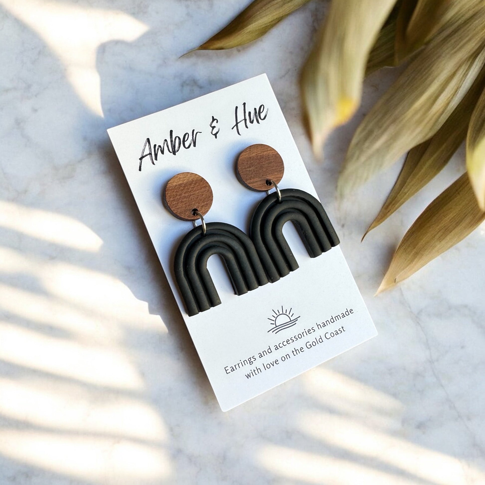 Channel your inner bohemian spirit with these captivating black arch dangle earrings, handcrafted from polymer clay and featuring unique wooden stud posts. This beautiful fusion of modern design and natural elements creates a timeless statement piece that complements your free-spirited style.