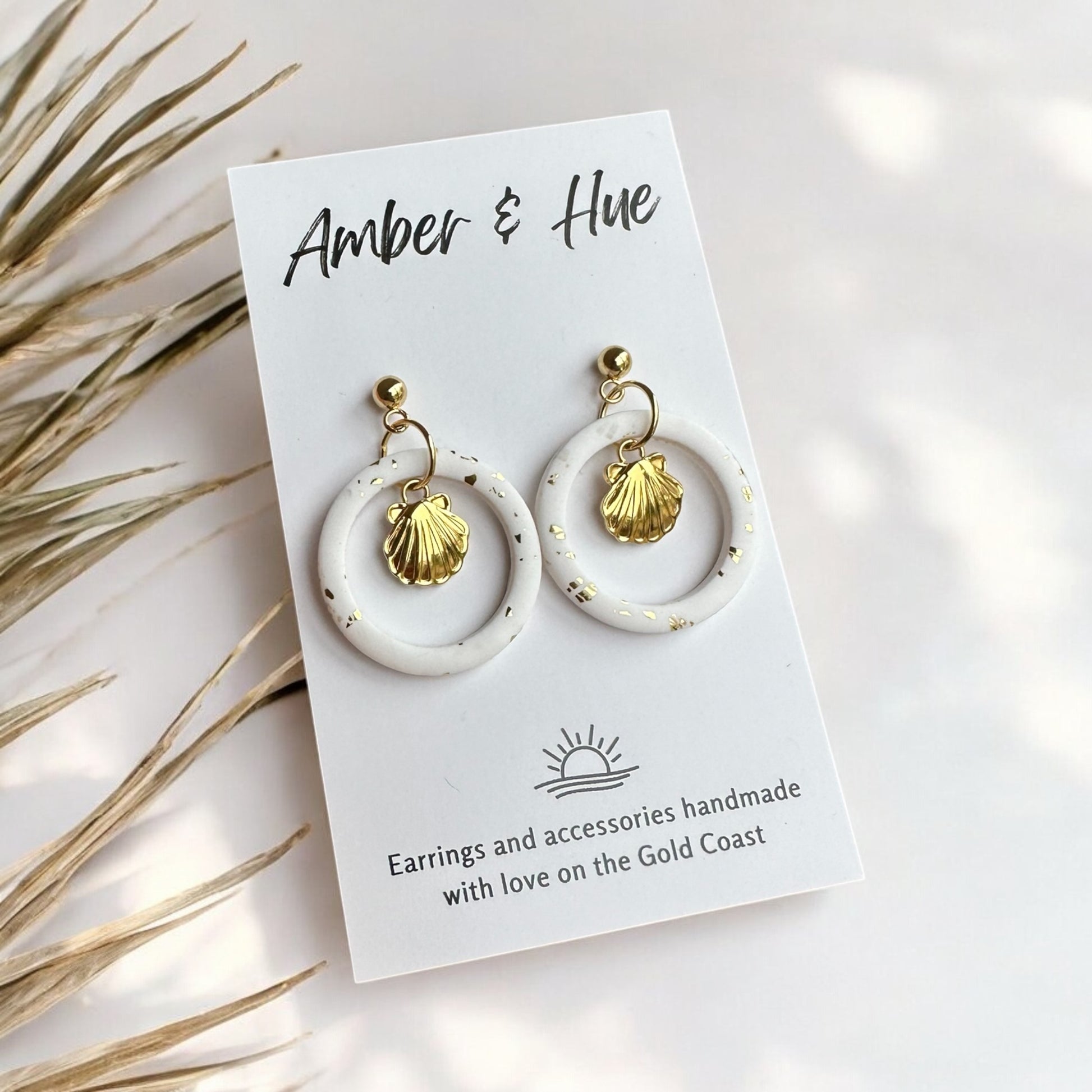 Embrace the serene beauty of the ocean with these exquisite Seashell White and Gold Dangle Earrings. Handcrafted with meticulous care from lightweight polymer clay, these earrings are the perfect blend of delicate artistry and coastal charm.