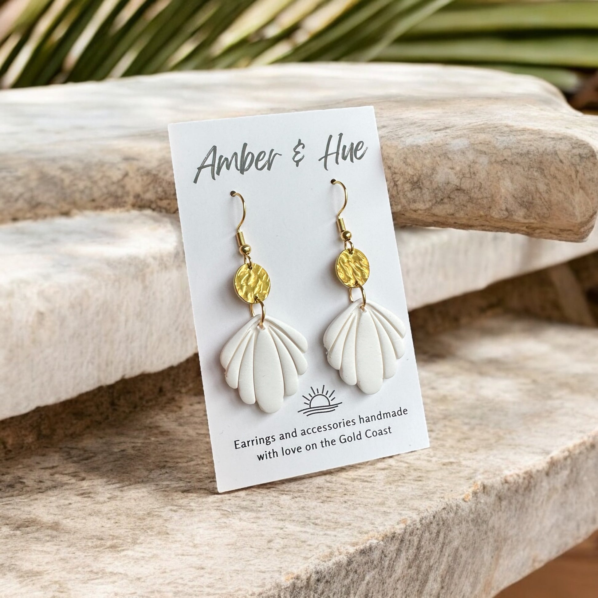 Capture the serene beauty of the ocean with these handcrafted White Shell Hook Earrings. Each pair is meticulously made from lightweight polymer clay, sculpted to mimic the delicate curves of real seashells. The crisp, clean white of the shells is perfectly complemented by a shimmering, dainty gold disk that adds a touch of refined elegance.