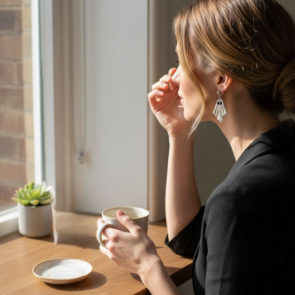 Each pair is carefully handcrafted from high-quality polymer clay and finished with hypoallergenic stainless steel hooks for all-day comfort. Lightweight and durable, they’re designed to move with you — adding just the right amount of eerie elegance to your look.