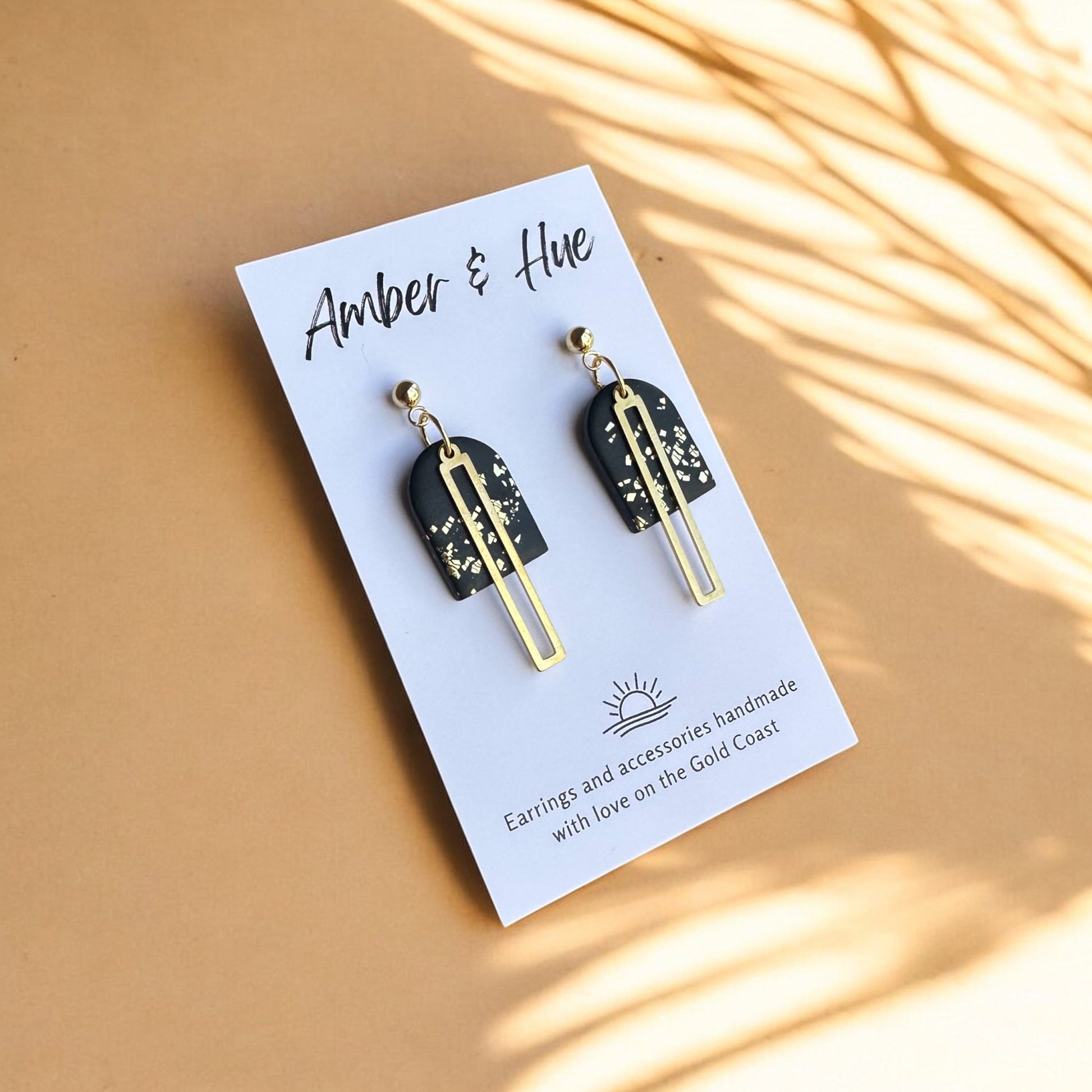 Whether you're looking for the perfect accessory to elevate your everyday look or a special gift for someone unique, these Small Black Arch and Gold Shimmer Accent Dangle Earrings are sure to impress.