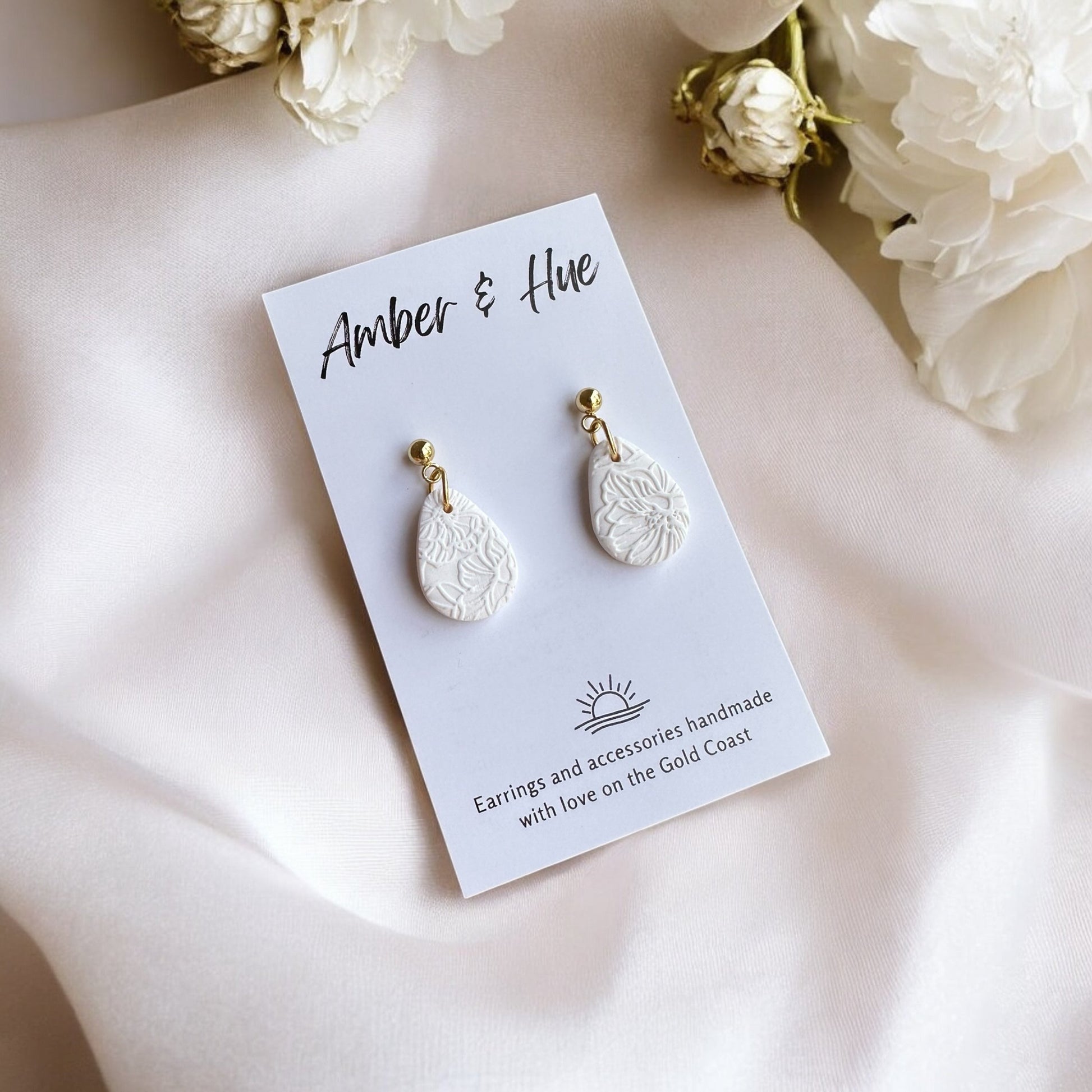 Capture the essence of spring with these exquisitely handmade teardrop earrings. Each pair features a delicate white flower imprint, meticulously pressed into high-quality polymer clay. The soft, creamy background enhances the intricate floral detail, creating a subtle yet captivating design.