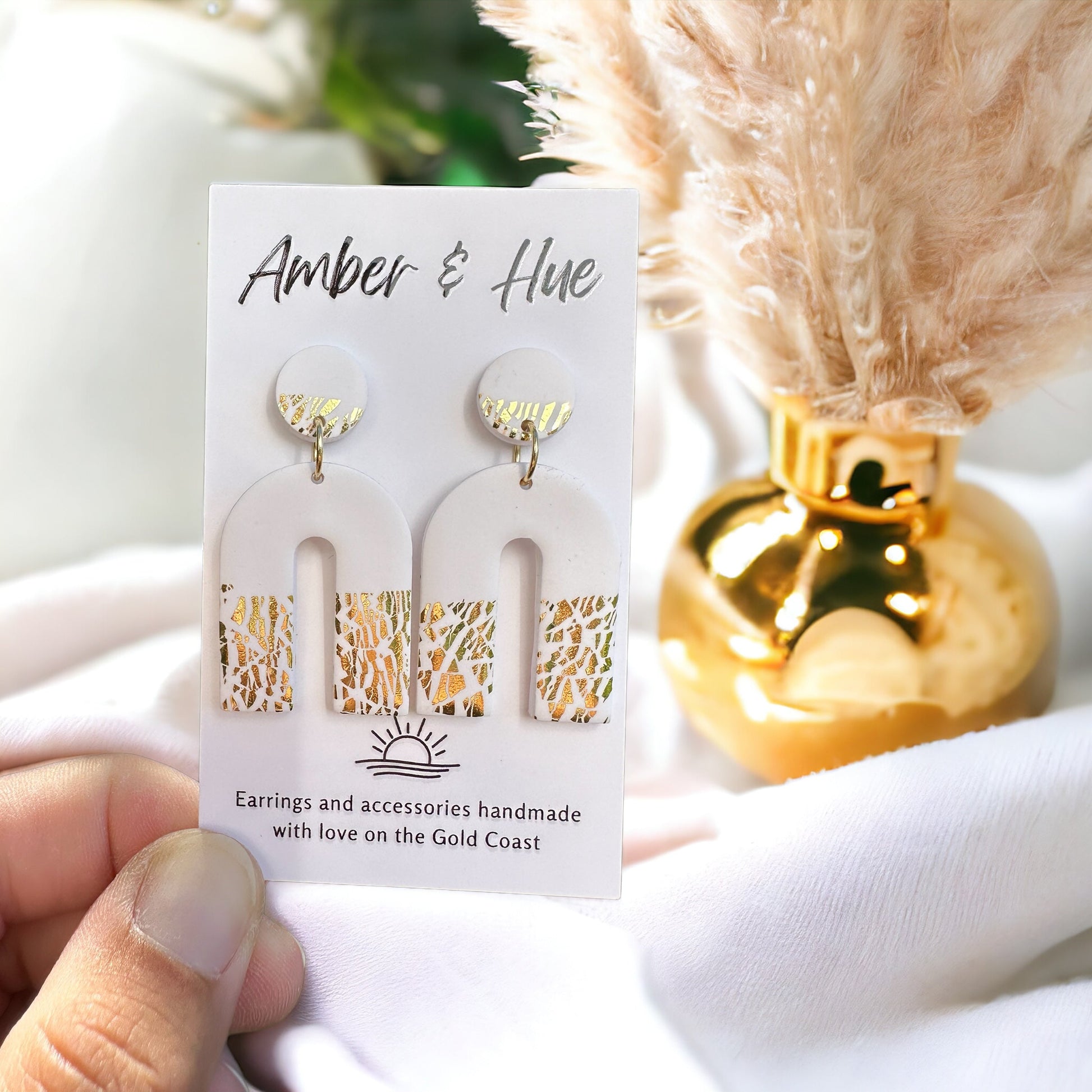 Command attention with these captivating white and gold statement arch dangle earrings, handcrafted from lightweight polymer clay. This modern and minimalist design allows the beauty of the sweeping arch and the elegance of gold to take center stage, adding a touch of luxury to your everyday look.