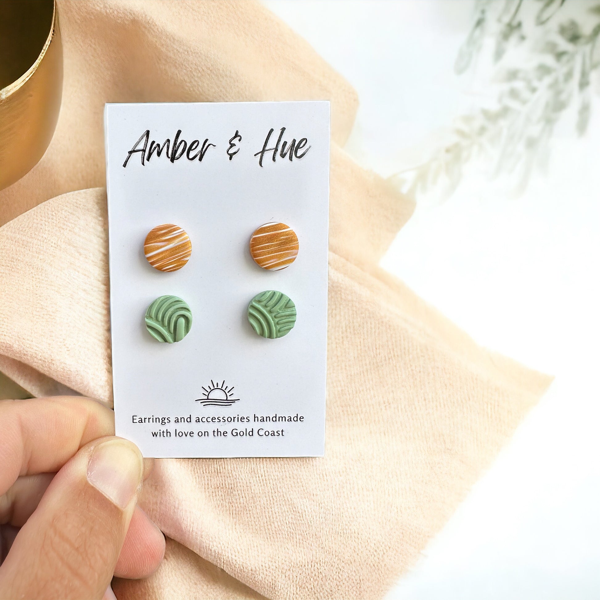 Double the Delight: Two-Pair Polymer Clay Stud Pack - Golden Marble & Textured Green
