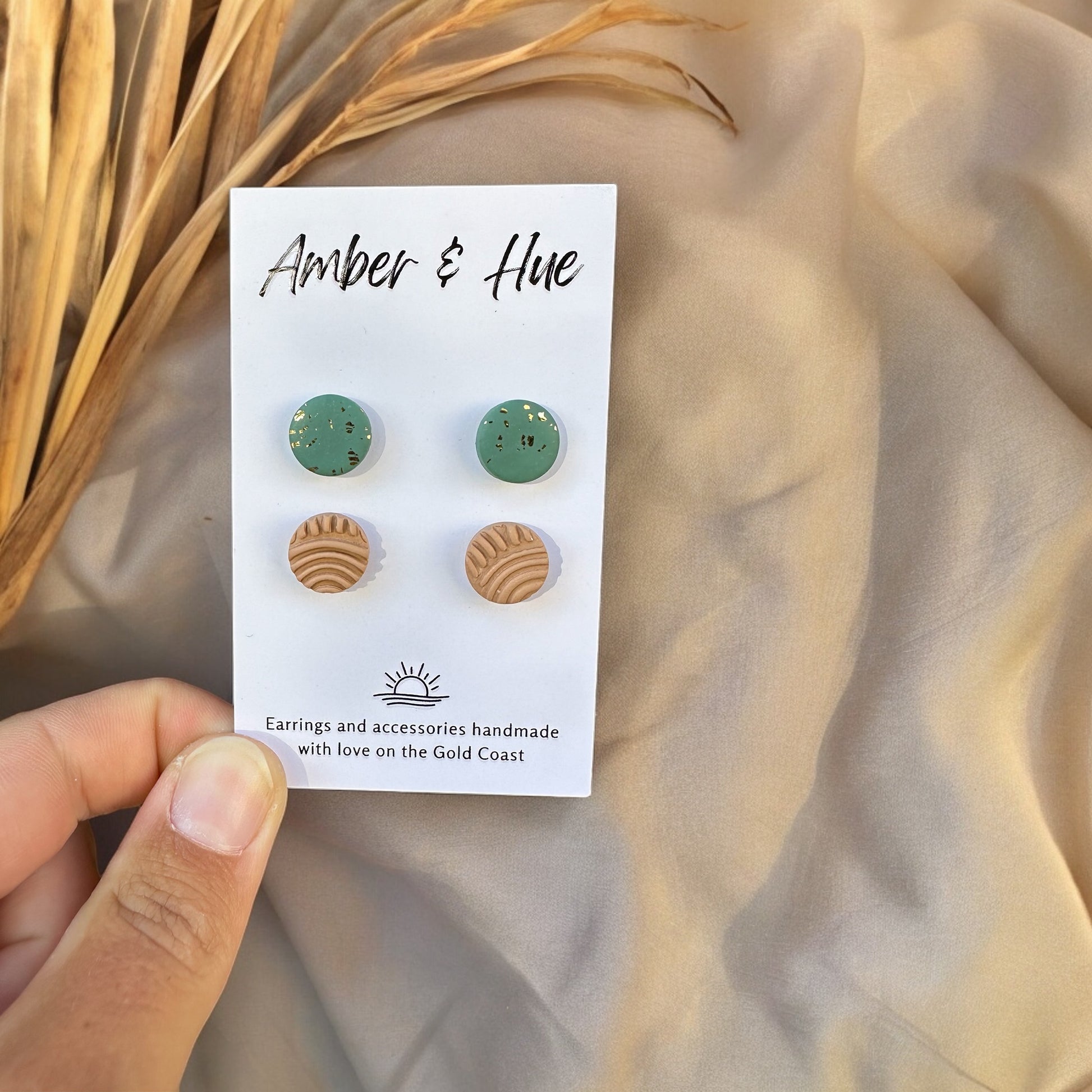 Looking for a versatile collection of earrings to add instant personality to your look? Look no further than our Stud Pack! This curated set features two stunning pairs of handmade polymer clay studs in complementary green gold and textured beige, offering endless possibilities for effortless style.