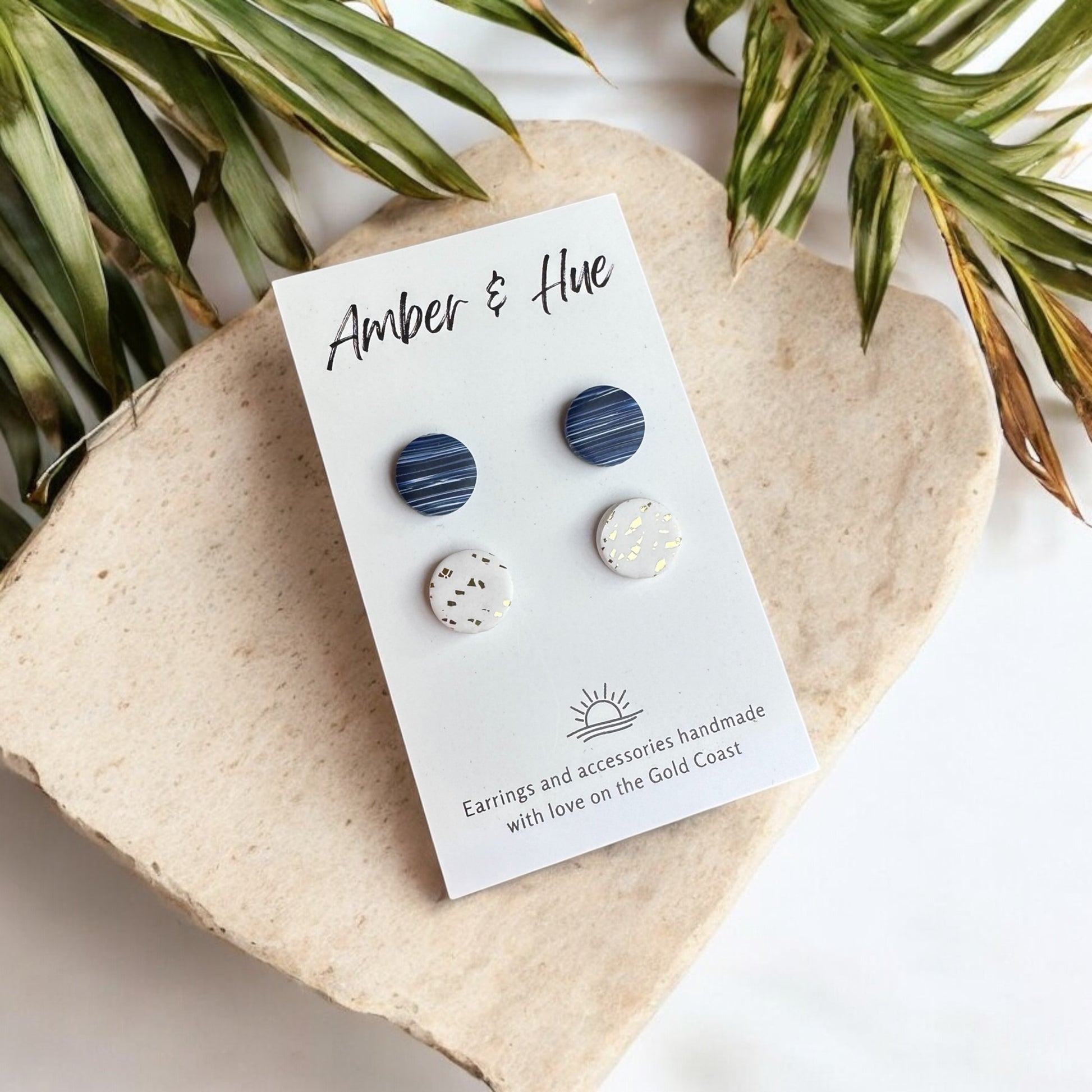 Elevate your everyday style with this captivating stud pack featuring a stunning marbled design in navy blue, white, and gold! Handcrafted from lightweight polymer clay, these versatile studs offer a unique blend of timeless elegance and modern flair, making them a must-have addition to your jewelry collection.
