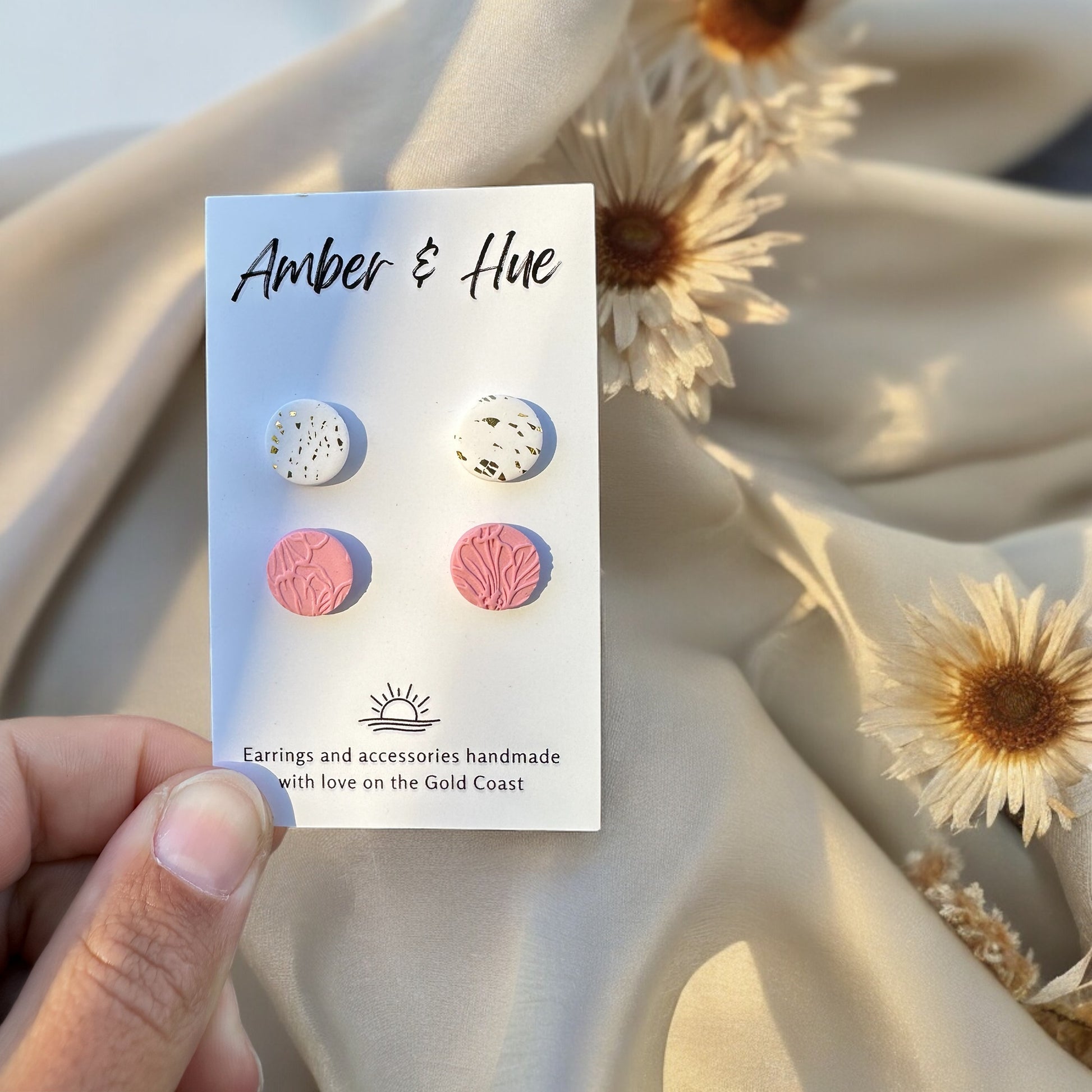 This delightful stud pack features two pairs of captivating earrings, meticulously handcrafted from polymer clay. One pair boasts a charming pink floral imprint, while the other features a touch of timeless elegance with white and gold detailing. This versatile set offers endless possibilities for adorning your ears!